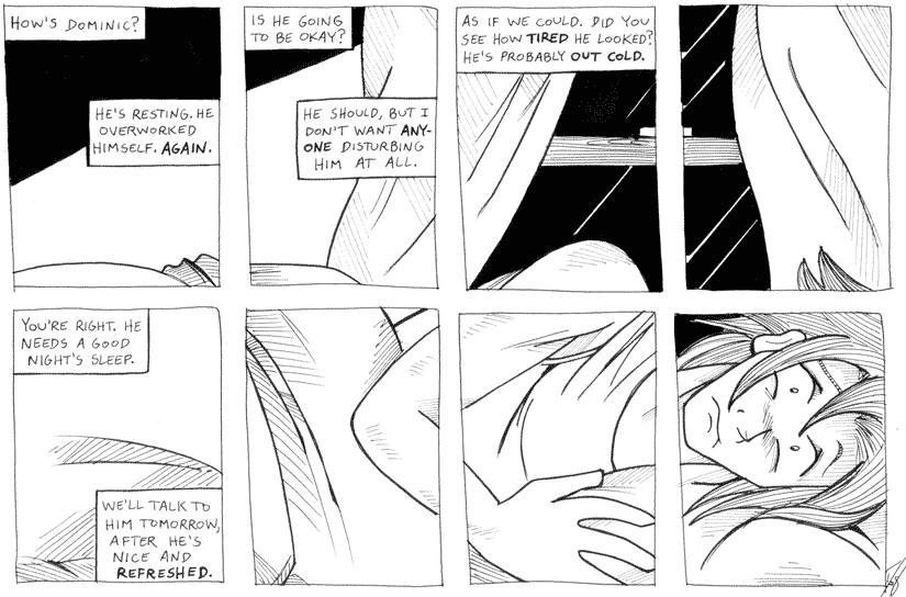 It looks like he put some effort into drawing the fifth panel here, and it actually looks kind of cool. That's the only panel of Dominic Deegan I have thought to be aesthetically pleasing, ever. I don't know if he can actually draw and is holding onto the dervative anime junk because he thinks that the "style" fits his comic, or the skeleton was just a fluke. Probably the latter.Let's highlight some gripes I've got with the comic's art:- Static fucking camera angles. Dominic Deegan is not a joke-a-day webcomic--it's got a narrative, it's supposed to evoke some sort of emotion in the reader. A good way to do that is to show movement and have variety in the angles. Does he do this? No. This page (for the most part; like I said, fifth panel is an anomaly) exemplifies his unwillingness to do anything but a flat, straight-on shot, over and over again. Dynamic angles and perspective are for losers who actually spend more than six minutes sketching their comic. What a waste of time that is.- He's inconsistent in drawing faces even when he is essentially copying them from one panel to the next. Here we see that he can't decide what Gregory's eyebrows look like, or if he even has them at all.- I also chose this page because it's that goddamned snout nose drawn over and over again. Has he ever looked at a human being from the side? Does he know that we have things called lips, and there is not, in fact, a straight drop from the tip of the nose to the chin?- Here, Gregory is sitting in a featureless white void, sitting near a large box, writing on paper in a way that no actual person would write on paper. This is like most panels. Also, it doesn't show his lower body. Mookie really hates the lower body (he can't draw legs worth shit and he knows it, so he gave up), so get used to not seeing it ever if you read Dominic Deegan.- He doesn't understand the upper torso either, mind you. This character is male. He looks like he has boobs. The only way you can tell that he is not female, in fact, is that Mookie didn't give him an eyelash at the side of his eye, and he's not wearing ridiculous revealing clothes.- What the fuck is with him and drawing random lines all over the characters' faces. What is it supposed to represent?? Is everyone blushing for no reason whatsoever all the time?