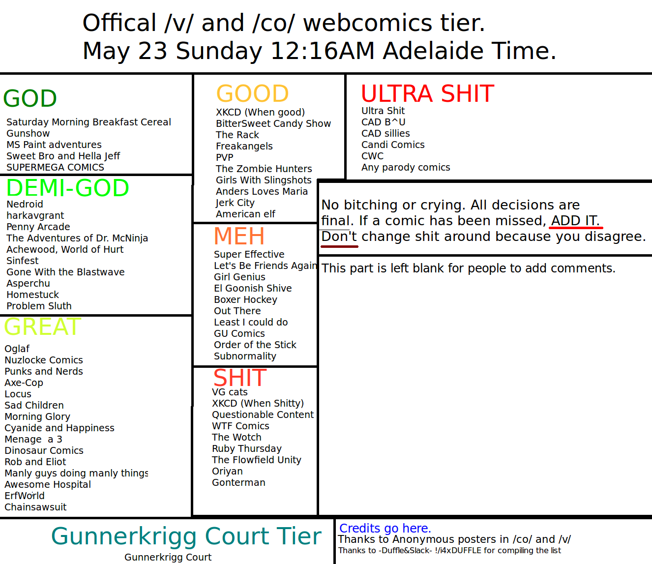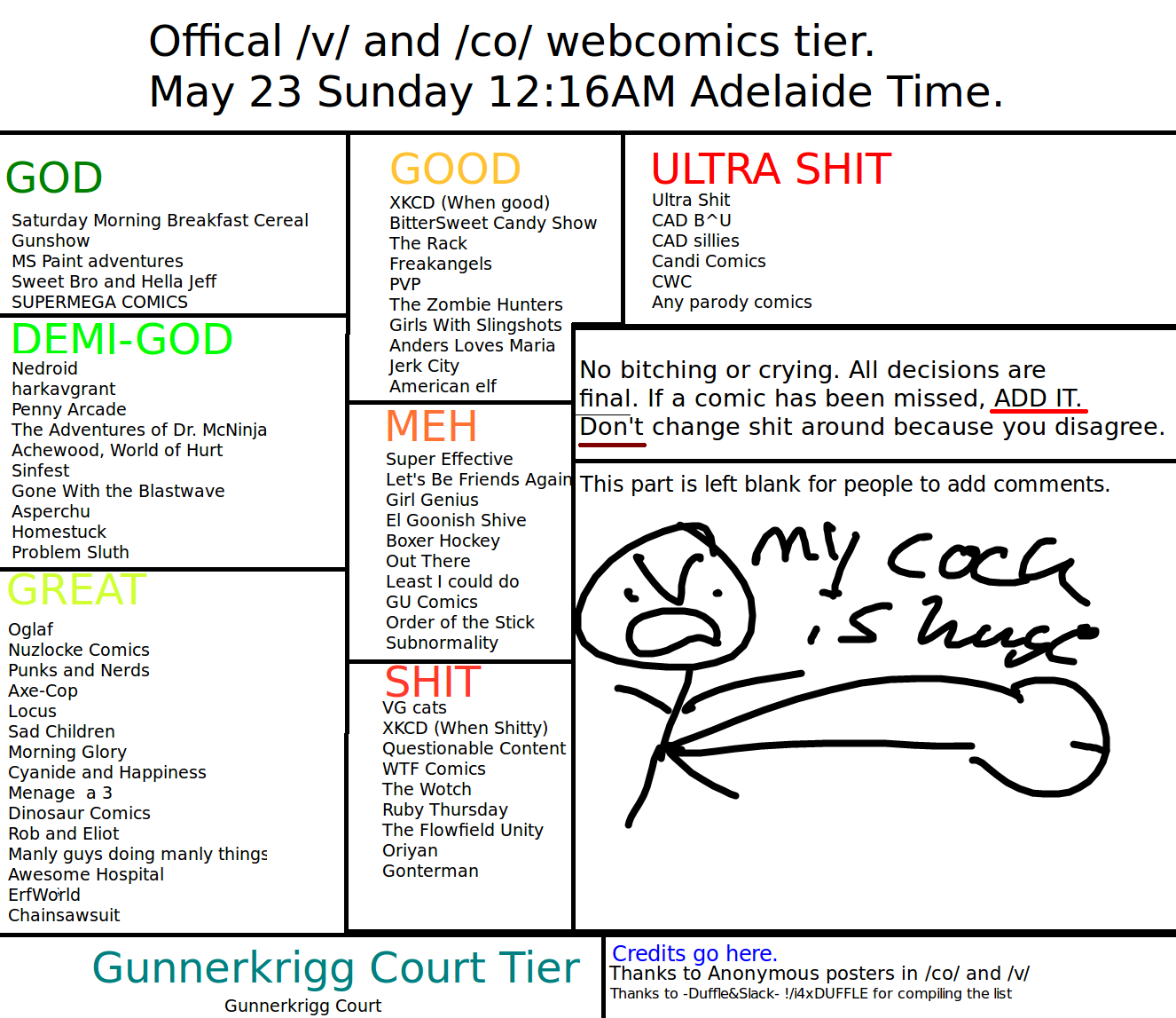 >>60725Anon is very right.If that weren't enough to convince you, the Deegan forums literally have no fans in both the official forums (which I think may have been shut down after Mookie realized no one like his shit) or the keenspot ones, only very annoyed snarkers and people who read his comic solely to laugh at how bad it is. It was featured on "Your Webcomic is Bad and You Should Feel Bad" and has its own hate megathread on Something Awful, a dubious honor previously reserved only for CAD.It's bad.Just awful.