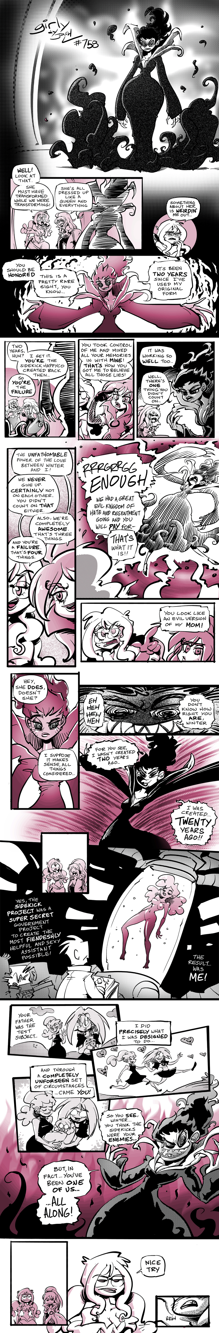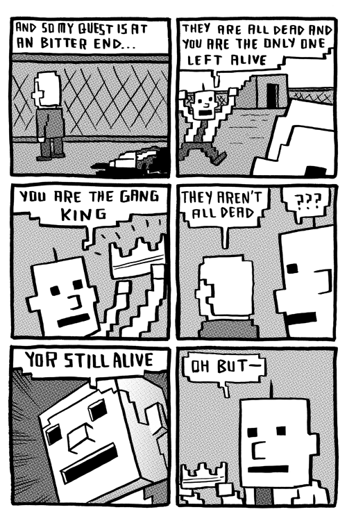 From the forums:>Okay! So! Lemme start from the beginning, I suppose!>The latest story arc was supposed to be a pretty significant one. Without spoiling anything, the end of it was supposed to start something for the comic. Not end the comic. Then, as you all saw, the comic stopped updating.>I will say as much as I can while saying as little as I can as I have reasons for keeping these things to myself, but the last year has not been a pleasant one for me. Started with one thing in August, I believe, and my wonderful family has managed to keep up a chain of events that have made my life very stressful. The past few months in specific have brought 3 attempted suicides within my family. I'm not joking. I've almost become desensitized to it all. Things have recently died down and I'm also removing myself from this stressful environment in the coming months.>Somewhere in that I posted here on the forums that I was ending the comic. The logic was I was not in a great place, I wasn't updating, and ultimately the comic was suffering because of it.>Fast forward to the E3 comic. I was doing okay, Nami showed me a thread with a forum goer saying how sad it would be without an E3 comic this year, and shortly after Ryan C prompted me for a guest strip. I decided that we couldn't have a year without an E3 comic, and we worked on both of ours together, and for the first time in ages, I had a good time drawing a comic. Was fun! Thanks to Nami, Ryan, and random poster 1235357! More events spoiled that good mood, but hey! C'est la vi. We got some comics up! Yay!>I was purposely vague about the update schedule. Haven't known when I'd be up to drawing it. Just that the updates were coming. The plan became, well, screw it. Let's get that original idea started up with the last arc! I've been planning to remove the last arc, rewrite it, and redraw it, and I will when I can, and update with random comics here and there (You should hopefully see one this week) until I get the arc fully fleshed out and ready to go up which should also be in the coming months. Hopefully September.>So! The reasons behind it all, I think. If anyone has any more questions regarding the comic, I'll be happy to answer them.>Oh, and I was thinking about posting more on the forums again. Why not toss that out there as well. What say you all? I AM LITERALLY TREMBLING WITH EXCITEMENT.I LOVE YOU FANBOYS.I LOVE YOU MR. DEWITT.I AM SO HAPPY RIGHT NOW.