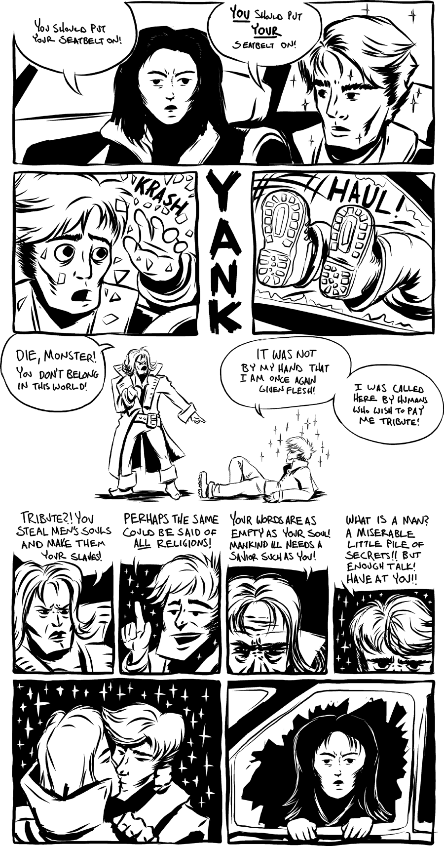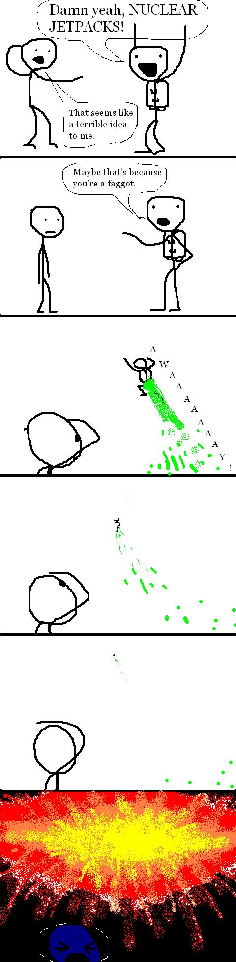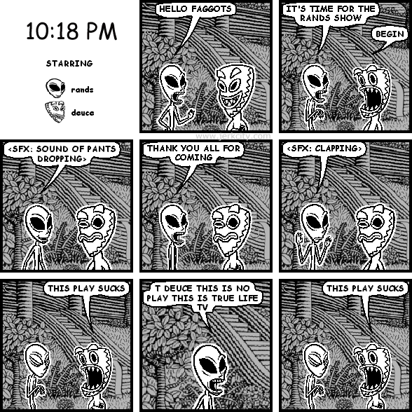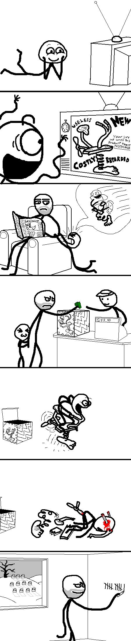 >>94604I *want* to be happy, but this also makes me want to go ahead and delete my bookmark.His "comeback" set of strips ("Whatcha Watchin'?") features a self-torturing artist (strip 1) killing himself (2) and his family (3). The unfinished story arc was clearly leading up to his primary characters acting out a "Final Destination" scenario. Yeah, I think I can read between *those* lines. Sure, he says everything's getting awesomer now. We'll see. Maybe.The vast majority of webcomicers, I've come to realize, are emotional eggshells who act like they're aluminum baseball bats. I deliberately trolled one who was using his newfound tiny fanbase as an excuse to scream U R ALL DUMFUX IM BIGAR TAN JEEZUS at the world, including his fellow artists. His responses alternated between LOL U MAD ROFL!!1 to playing the ol' race card to screaming rants against other critical posters he assumed to be me--before finally cooking up a SUPER COOL STALKER STORY BRO, complete with a fictional (and bizarrely homoerotic) threat (naturally "reported to my ISP and the authorities," who strangely had no idea what I was talking about when I inquired, honk honk). Cherry on top: he strongly suggested he might commit suicide if I wasn't dealt with. (There's a SUPER COOL SUICIDE STORY BRO in the site's history, apparently.) I was peebo'd, but it was totally worth. And he hasn't been acting like such a complete and utter asshole lately, so maybe it all worked *exactly as planned.*)The difference here is, I like "Fanboys," and I have no personal opinion of DeWitt beyond the strip itself. But I don't want to sit on this bus while he keeps asking, "Which would you do? Pills or razor blade? I'm not gonna do it, I'm just askin'."