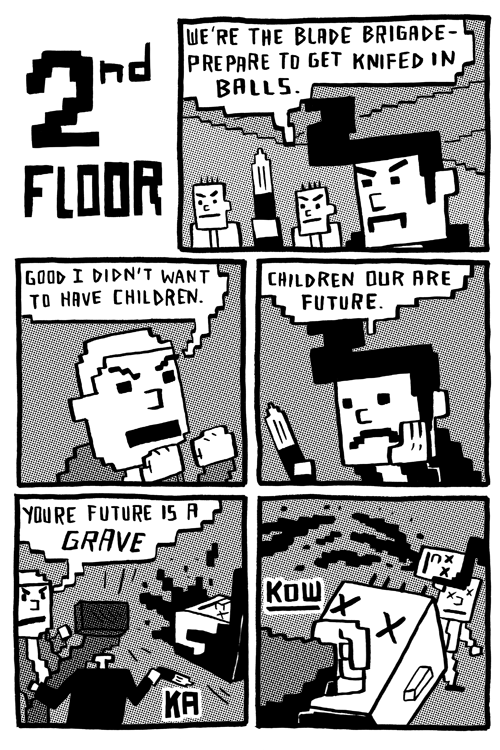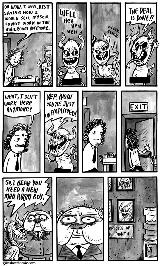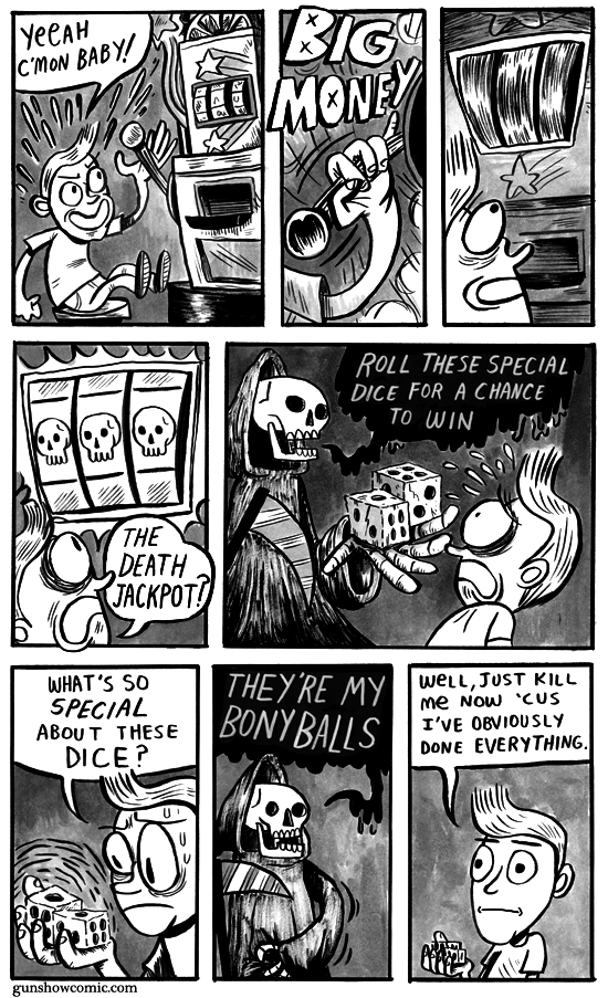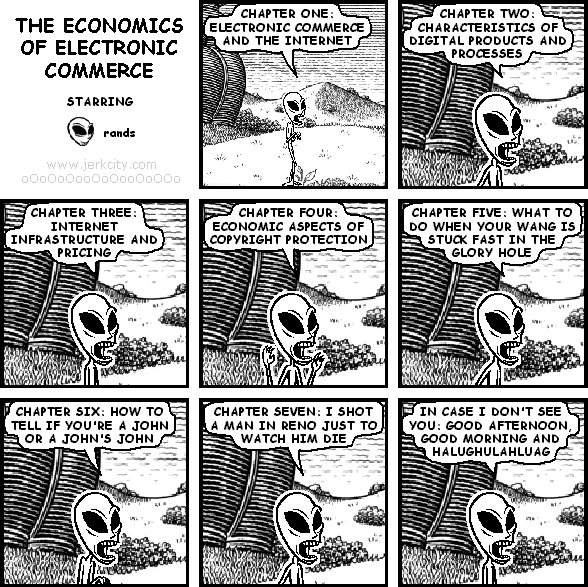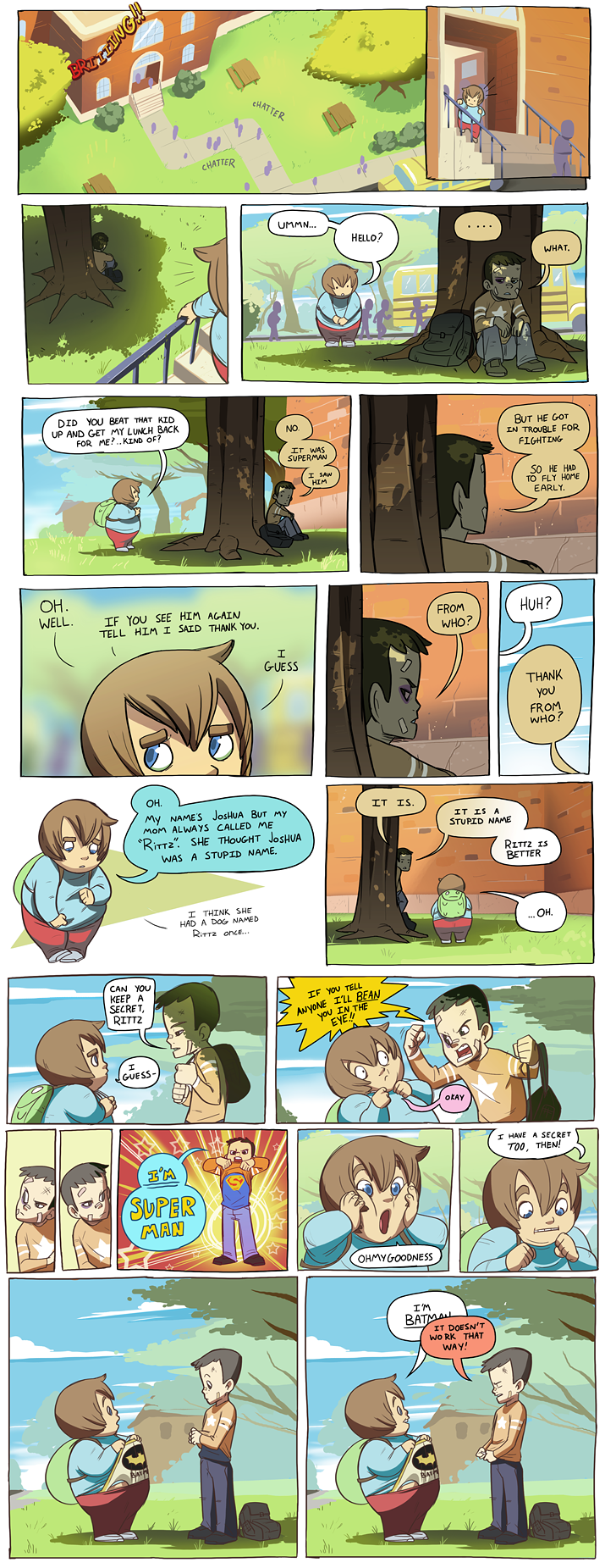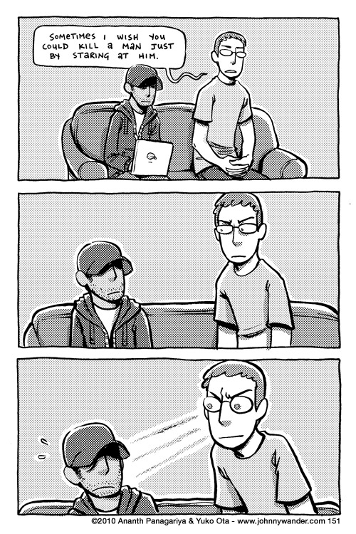 >>94604I *want* to be happy, but this also makes me want to go ahead and delete my bookmark.His "comeback" set of strips ("Whatcha Watchin'?") features a self-torturing artist (strip 1) killing himself (2) and his family (3). The unfinished story arc was clearly leading up to his primary characters acting out a "Final Destination" scenario. Yeah, I think I can read between *those* lines. Sure, he says everything's getting awesomer now. We'll see. Maybe.The vast majority of webcomicers, I've come to realize, are emotional eggshells who act like they're aluminum baseball bats. I deliberately trolled one who was using his newfound tiny fanbase as an excuse to scream U R ALL DUMFUX IM BIGAR TAN JEEZUS at the world, including his fellow artists. His responses alternated between LOL U MAD ROFL!!1 to playing the ol' race card to screaming rants against other critical posters he assumed to be me--before finally cooking up a SUPER COOL STALKER STORY BRO, complete with a fictional (and bizarrely homoerotic) threat (naturally "reported to my ISP and the authorities," who strangely had no idea what I was talking about when I inquired, honk honk). Cherry on top: he strongly suggested he might commit suicide if I wasn't dealt with. (There's a SUPER COOL SUICIDE STORY BRO in the site's history, apparently.) I was peebo'd, but it was totally worth. And he hasn't been acting like such a complete and utter asshole lately, so maybe it all worked *exactly as planned.*)The difference here is, I like "Fanboys," and I have no personal opinion of DeWitt beyond the strip itself. But I don't want to sit on this bus while he keeps asking, "Which would you do? Pills or razor blade? I'm not gonna do it, I'm just askin'."