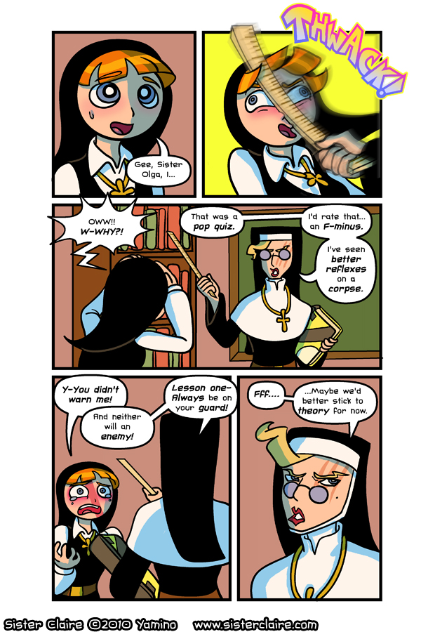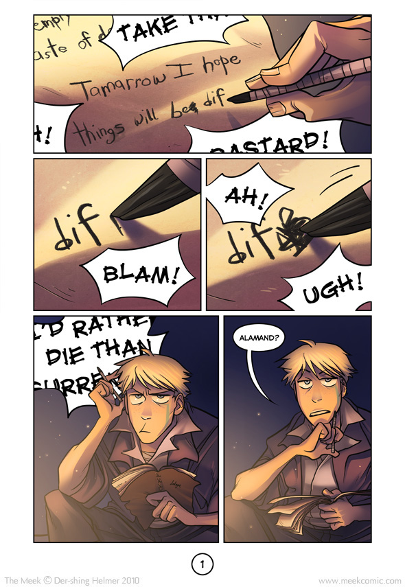 It looks like he put some effort into drawing the fifth panel here, and it actually looks kind of cool. That's the only panel of Dominic Deegan I have thought to be aesthetically pleasing, ever. I don't know if he can actually draw and is holding onto the dervative anime junk because he thinks that the "style" fits his comic, or the skeleton was just a fluke. Probably the latter.Let's highlight some gripes I've got with the comic's art:- Static fucking camera angles. Dominic Deegan is not a joke-a-day webcomic--it's got a narrative, it's supposed to evoke some sort of emotion in the reader. A good way to do that is to show movement and have variety in the angles. Does he do this? No. This page (for the most part; like I said, fifth panel is an anomaly) exemplifies his unwillingness to do anything but a flat, straight-on shot, over and over again. Dynamic angles and perspective are for losers who actually spend more than six minutes sketching their comic. What a waste of time that is.- He's inconsistent in drawing faces even when he is essentially copying them from one panel to the next. Here we see that he can't decide what Gregory's eyebrows look like, or if he even has them at all.- I also chose this page because it's that goddamned snout nose drawn over and over again. Has he ever looked at a human being from the side? Does he know that we have things called lips, and there is not, in fact, a straight drop from the tip of the nose to the chin?- Here, Gregory is sitting in a featureless white void, sitting near a large box, writing on paper in a way that no actual person would write on paper. This is like most panels. Also, it doesn't show his lower body. Mookie really hates the lower body (he can't draw legs worth shit and he knows it, so he gave up), so get used to not seeing it ever if you read Dominic Deegan.- He doesn't understand the upper torso either, mind you. This character is male. He looks like he has boobs. The only way you can tell that he is not female, in fact, is that Mookie didn't give him an eyelash at the side of his eye, and he's not wearing ridiculous revealing clothes.- What the fuck is with him and drawing random lines all over the characters' faces. What is it supposed to represent?? Is everyone blushing for no reason whatsoever all the time?