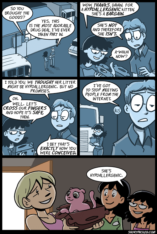 >Davan is on loan from Something*Positive and the kitten is the offspring of Davan’s cat and Hazel’s cat from Girls With Slingshots. I hit both of these sites every single day, and if you aren’t reading them as well, then by golly you should be!>Webcomics are so incestuous.These shared universe shenanigans are starting to freak me out.