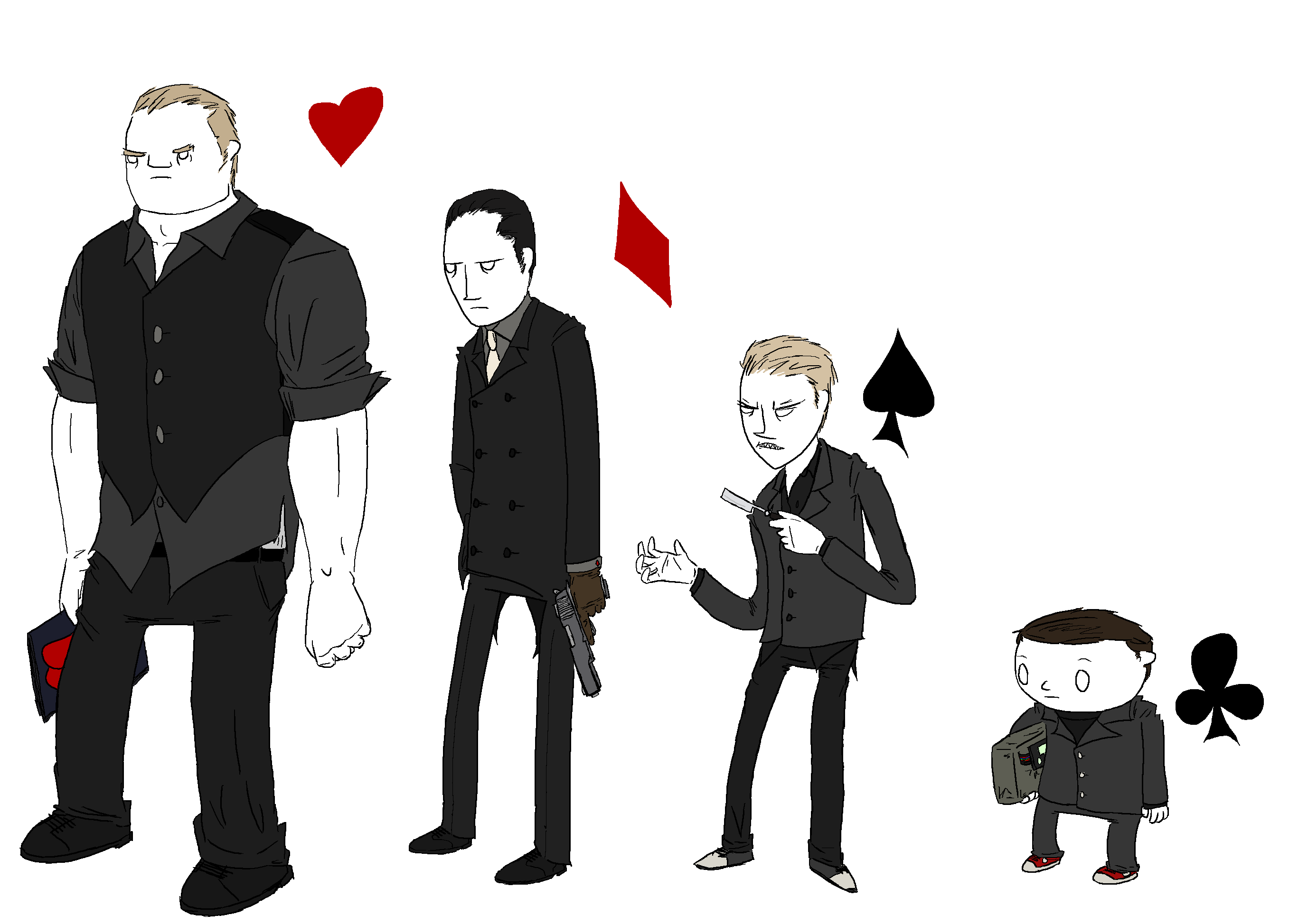 So we have:-Spades Slick =>Karkat-Black Queen=>Terezi-Hearts Boxcars=>Tavros-Clubs Deuce=>SolluxOnly two original trolls missing are Kanaya and Vriska (all red team was the original trolls) and the only members of the midnight crew missing is Diamonds Droog, who share some characteristics with Kanaya (both like clothes, etc.)Thinking about it...who will be the sixth Exile? Becuase he will end with Vriska... Wait, any chance of Shadow Mobster Kingpin existing in this universe and ending with Vriska?