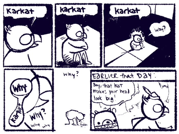 >>87849True that.Which reminds me; I really hope we get to see freaked-out Karkat surrounded by the all the grubs.
