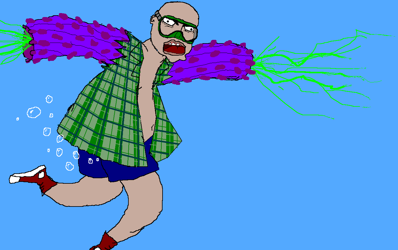 Sea Cucumber Dude!Protecting the coast with his ability to liquefy himself, breathe underwater (out of his anus), and eject entangling viscera from his grotesque misshapen arms!