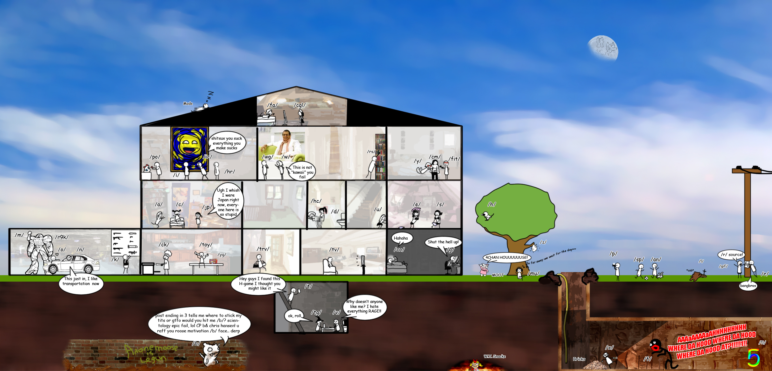 Ok, well, I thought it was a little silly to make the thread here, but somebody was very insistent about it, so whatever, here we go. The general idea is to create a nice image that represents the overall feelings of as many boards as possible that gives a semi-infographical and semi-illustrated account of the familial relationships of the boards of 4chan. For example, /jp/ could be depicted as the next-generation offspring of /a/ and /v/, /l/ would be depicted as a dead ancestor, and /b/ would be the crazy alcoholic uncle that nobody wants to talk about.We ought to try to respect any existing board-mascots (e.g., /x/-tan) to get cues about both the appearance and the gender of the board's anthropomorphic personification.Pic related, it's along the lines of what I want to do, except I'd like to illustrate the relationships somewhat more... infographically, to use that word again (it should look more like a family tree with pictures on it than an actual picture of a house or something).