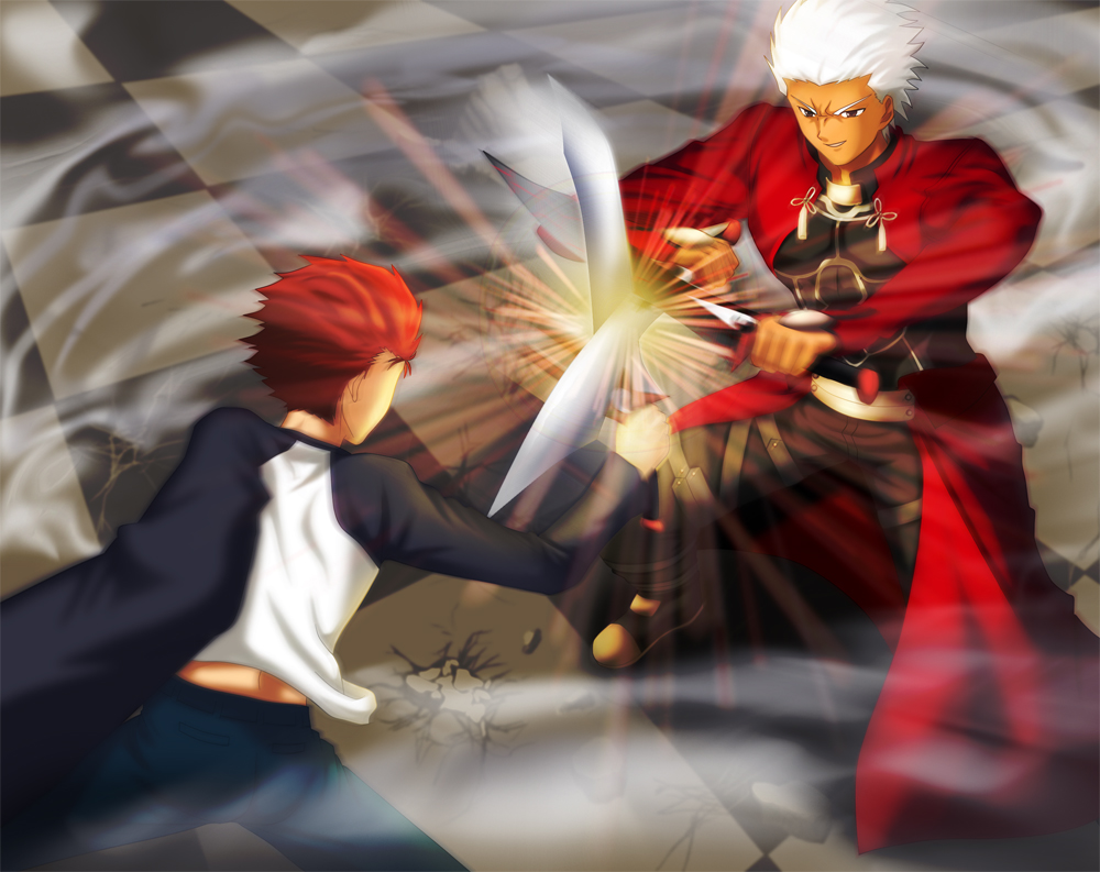 “Alright Assassin…Where’s this fight at?”“The large park close to the city.”That park is very eerie and desolate. Barely anything but grass grows there…Perhaps it was made on burnt ground.“Are you escorting me?”“Certainly.”You arrive at the park and begin to stealthily move around, following Assassin’s very feint presence. In the distance you can hear the sound of swords striking. Assassin takes you to a spot with a slight hill. It’s hard to hide here considering there are no trees, but you lay as low as possible to hide in the grass.Below Shirou fights with Archer as if they are even. The two both wield the same pair of Chinese blades. After several hits they are destroyed, but instantly replaced once again. They both have the same ability…Just who are these two…They break away from each other. On Archer’s side is Tohsaka. Her expression is the same as yours – one of surprise and shock. On Shirou’s side are Caster and his master, Illyasviel von Einzbern. At that moment, you realize something is different about Shirou…His skin is slightly tanned and bronze like. His hair is even redder than before, and his eyes are glowing gold…Wasn’t he just an amateur?!Tohsaka begins to talk. You use focus on your hearing and sight so the battle might as well be displayed right in front of you.“U-Unbelievable…Archer…Shirou from the future…And Caster’s magic! You really are the greatest wizard!”“Ho ho ho! Why thank you young lady! Unlocking Shirou’s potential was just a simple overnight ritual for me. And unlike your servant there who FORCED his potential, I’ve unlocked Shirou’s naturally with my magic! Really, forcing it like that resulted in your hair turning as white as my beard! Ho ho ho!”“That’s right!” Illyasviel jumps up enthusiastically. “Strength up! Speed up! ALL stats up! Shirou is practically as strong as you Archer! He’s SUPER SHIROOOOOU!”“Am I hearing this right, Assassin? Caster used some ritual to increase Emiya Shirou’s abilities?”“Indeed. It’s not a surprise considering several mages have done the same. Example in Greece, Medea did something similar for Jason.”This Assassin seems to like to talk.“But how can he create weapons just like Archer?”“Did you not hear? Archer is Emiya Shirou in the future.”At fist you want to exclaim “what”, but you remember the fact that Heroic Spirits can be summoned from any point in time. This explains why no one could figure out Archer’s identity.“So Caster unlocked his magic abilities as well…Shit.”This is bad. Caster, Einzbern, Kiritsugu, Saber, and now ‘Super Shirou.’ A force like that would wipe out you and Berserker easily.“Heh. You fool.” Archer smirks at Shirou. “You have no battle experience. You will still lose. I will kill you and change everything!”Archer charges towards Shirou and they begin to fight again. Archer has the edge, but Shirou seems to be learning incredibly quickly, copying Archer’s moves and making them his own. Could his intelligence have increased as well?You’ve learned much from watching this fight. If you stay longer you might get seen. But on the other hand, there might be an opening to attack once they’ve weakened each other…StayLeave