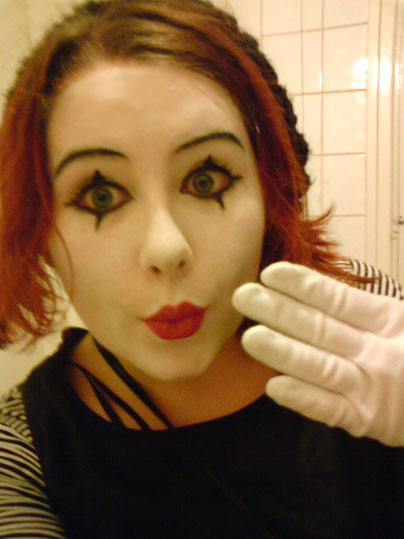 >>19077 It's me dressed as a mime in my friend's bathroom, pulling a stupid face. My hair is in bunches, the thing on my head is a beret and the black lines on my collar bone is my bag strap. Also, stupid sexy mimes.>>19076 Because you do?