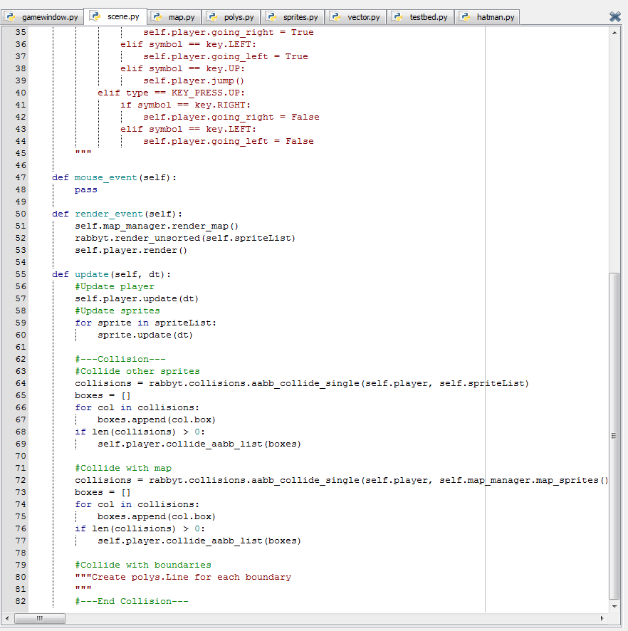 >>21720Someone asked about it? Did it get any results? If not, then maybe you should ask someone yourself. Because i've checked that code and while it would take a looooong time to read it all, there really seems that some codes don't connect with what they should in the collision parts. I could be wrong though, it's just a feel. I didn't read all of it, nor do I know all that much about Python/Rabbyt/Pyglet coding.