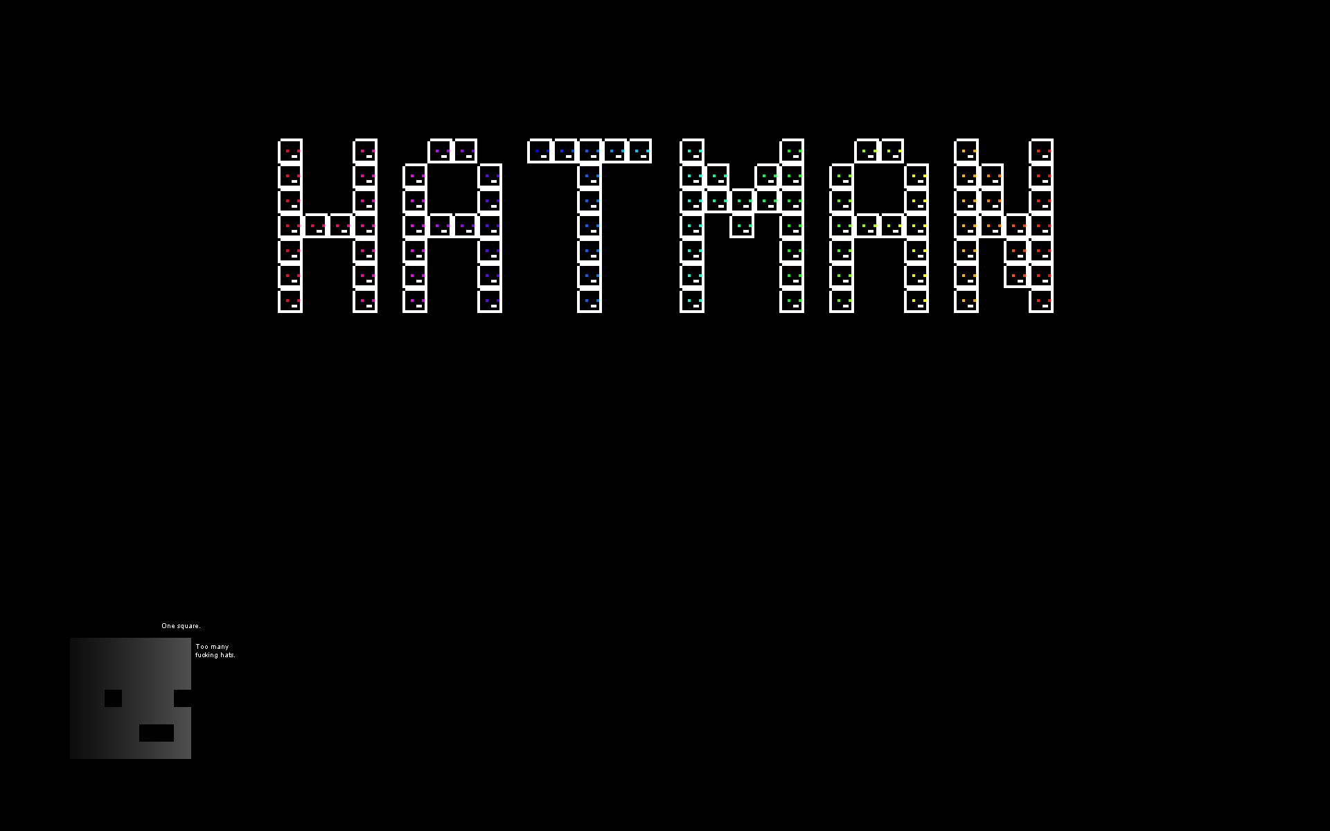 After like twenty people asking me to, I've moved the Hatman threads here.To those who are new to Hatman, Hatman is a 2D sidescroller where you play as Hatman. As Hatman, your job is to collect and wear hats. These hats have no effect on your abilities, they give you no new power, and they have little to no use. Hats are collected throughout levels or are randomly given to you over periods of time. You have as much chance of getting a hat when you first start as you will two hours into the game. Hatman was primarily based off of Team Fortress 2, but it plays completely different. Hatman features over 87 bazillion hats, most of which were made by 4chan's /v/ and /co/ with guest star /tg/.Anyone is free to use the template on the top left of this sprite sheet and make their own hatman and submit it for use in the game.