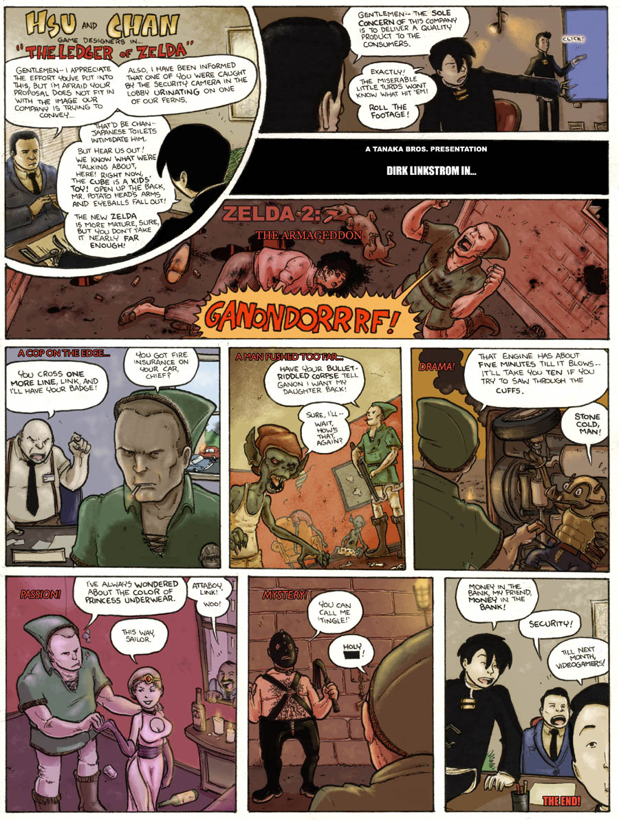 I'm not sure if this will actually go anywhere, but it's fun to talk about: The Legend of Zelda set in a noir theme.Short plot derived between myself, Spider-Anon and Doctor Hal: Detective Link and beat cop Linebeck must discover the truth behind the disappearance of popular lounge singer "Princess" Zelda. Suspects include the rival singer Midna, who had a lot to gain from Zelda's vanishing act, suspected mafioso Ganondorf, who has been a long-time fan of the Princess, and was recently spurned by her after a private proposition, and Zelda herself, who has disappeared on many an occasion in costume to live her life away from the glitz and glamour of the stage, this time deciding to stay gone permanently.Other stuff I decided: There'll still be the different races; Hylians, Goron, Zora, maybe the Kokiri. Whether or not swords and sorcery will still be included is still up in the air. Ganon's lieutenants will be Vaati and Zant, and the three of them look damn nice in suits. Zant rips his whenever he gets overly-excited.