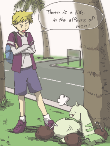 Sora climbed up the tree with skill and precision as she pulled Mimi up and untangled her leg.“I owe you one Sora,” she said as she slid down the tree and retrieved her cowboy hat, for no reason at all she turned her back to us and then tilted her hat forward and stuck a pose, he head half turned to us, “Still needs a little work I mean I don't have anything to hold while I'm doing it,” she said. I was becoming convinced we were all a little unhinged, as for Jou...“GeditoffGeditoffGeditoffGeditoffGeditoffGeditoffoffoffoffoffOFF!” Not exactly the most dignified showing, but understandable. See his partner Pukamon was so happy to see him he just sorta latched onto his back and never let go. Now he latched onto Jou's blind spot so he couldn't see whatever was on him but he knew something was there. Mimi had heard him screaming and was trying to tell him when she fell from the branch and tangled her legs in the vine. By comparison our hiding tree escapades were starting to look dignified, well we couldn't have that so we found Yamato and Takeru sitting down on some smooth rocks as they listened intently to there partners... okay Yamato listened intently, Takeru was playing around with his partner Tokomon and generally doing what a little kid should. I was actually kinda envious of the both of them, here we had panicked and thrown out half questions and answers but Yamato had held it together to get things straight with his and Takeru just accepted the whole thing and decided to have a blast.So there we were sitting on smooth stones as our Partners lined up to face us.“First question,” Jou asked having recovered his composure enough to represent us “What are you, and don't go shouting off your names we know that much, what is your collective species?” Jou definitely got through to the creatures, and Koromon hopped forward to represent them.“We're Digimon, or rather everything is a Digimon here, except for the things that didn't evolve that far.” Koushiro whispered in Sora's ear, “You have a pencil or something? I want to take notes on this” Sora glanced back at him.“Koushiro we were playing in the snow when we came here I didn't have time to grab any stationary. Why don't you just use your laptop?” Koushiro waited all of 3 seconds before pulling out his laptop computer and hurriedly typing out notes.“And were are we?” Jou continued.“The Digital World.” several things happened then. I froze in confusion, Sora seemed to have a smile spreading on her face while Koushiro began writing a few paragraphs of speculation. Mimi looked concerned, and Yamato was holding Takeru close to him, Takeru to his credit took this in stride and didn't cry.Jou didn't seem phased by what they said, after a few moments of silence he responded.“How did we come here?” but before they could answer a familiar buzzing I had associated with fear had returned. It was then I noticed what I failed to before, the Digivice was heating up around my wrist as danger approached.“We have to go now.” I said as Koushiro noticed the same thing and closed his laptop putting it away. Yamato looked at his wrist then at me, he didn't say anything but he gave me a slight nod which felt reassuring. Koushiro may agree with my decisions because he's my friend but Yamato was someone I had to earn the respect of.We took off our Digimon leading the way, we ducked in and out of trees as the buzzing sound grew louder. I was at the head of the pack and turned my head slightly to see Sora urging Mimi on, Takeru riding on Yamato's shoulders as he forged ahead, Koushiro keeping a brisk pace as Jou was in the rear making sure no one fell behind.I would like to say we were moving in strategic formation, but really we were just adhering to our personal traits and Jou would never leave someone behind. The old saying goes 'I don't have to be the fastest, just faster than the slowest guy' well in Jou's case he would rather futilely fight than leave someone behind.We arrived at a cliff face just outside the forest as we slowed down. We were tired, running on the soccer pitch was one thing but dodging around tree's and natures bumps and ditches wore you out. Even in peak physical condition a 12 year old is still 12 and even then our guides weren't very good.“A cliff face is the worst possible place we could be,” Yamato gasped as he let Takeru down, he looked to the rest of us “Do we have any sort of rope we could climb down, and even then we don't have a boat of any kind to brave the water which most likely leads off a waterfall. And worst of all-” he was cut off as Kuwagamon made a pass over us, Yamato flattened Takeru and Koushiro to the ground as Jou knocked Sora down. Mimi didn't need anyone to warn her and just dropped as did I. “Worst of all is we can't retreat.” Yamato shouted over the loud buzzing as Kuwagamon landed in front of us.I described how the wave felt earlier, how it felt like my body was dying. I realized that the same thoughts were flying through my head now, that I was going to die and that this thing was going to kill me.“Attack!” Tsunomon shouted, it was the first time I had heard the little guy speak and all of a sudden a wall of pink bubbles crashed on Kuwagamon, it was as effective as it sounded, and Koushiro shook his head “There is no way we can beat that thing...” Tokomon opened his jaw to reveal row after row of sharp teeth as he attempted to bite Kuwagamons leg but it was worthless as Kuwagamon beat his giant wings sending the Digimon flying back to us.“You're done enough!” Mimi cried out, “You can save yourselves you don't have to keep fighting” but her pleas didn't stop them from hoisting themselves up and charging Kuwagamon again. Sora was standing transfixed at the battle as Yamato was searching for a way out.“We have to win!” Jou shouted, “C'mon Pukamon, I'm not running away!”“Tokomon! I wont lose you!”“Tanemon! We have so much to talk 