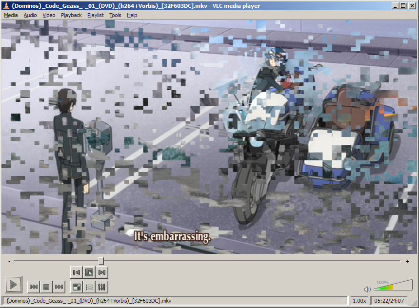 >>21951 >>21954 >>21959 >>21967 >>21971 VLC is essentially considered taboo by most int he video encoding/fansub community. it's so full of bugs and fail that people gave up on bothering with it years ago. The font issue stems from the fact that teh styled sub is built around VSfilter, players like SMplayer use their own internal filters that aren't full compatible with the most modern subtitling methods. Most people will not have the fonts I use, so for the softsubs they're 'packed into' the .mkv, and the player has to be smart enough to know to look for them there. I know I've said it a few times previously, but my releases are tested for full and complete compatibility with CCCP (http://www.cccp-project.net/). If you can't/won't use it and are experiencing troubles, I'd just suggest you wait for the hardsub, as that requires no specific software to play back except a decently modern video player (I hear even VLC can play it without blocking the crap out of the screen on occasion [pic related])
