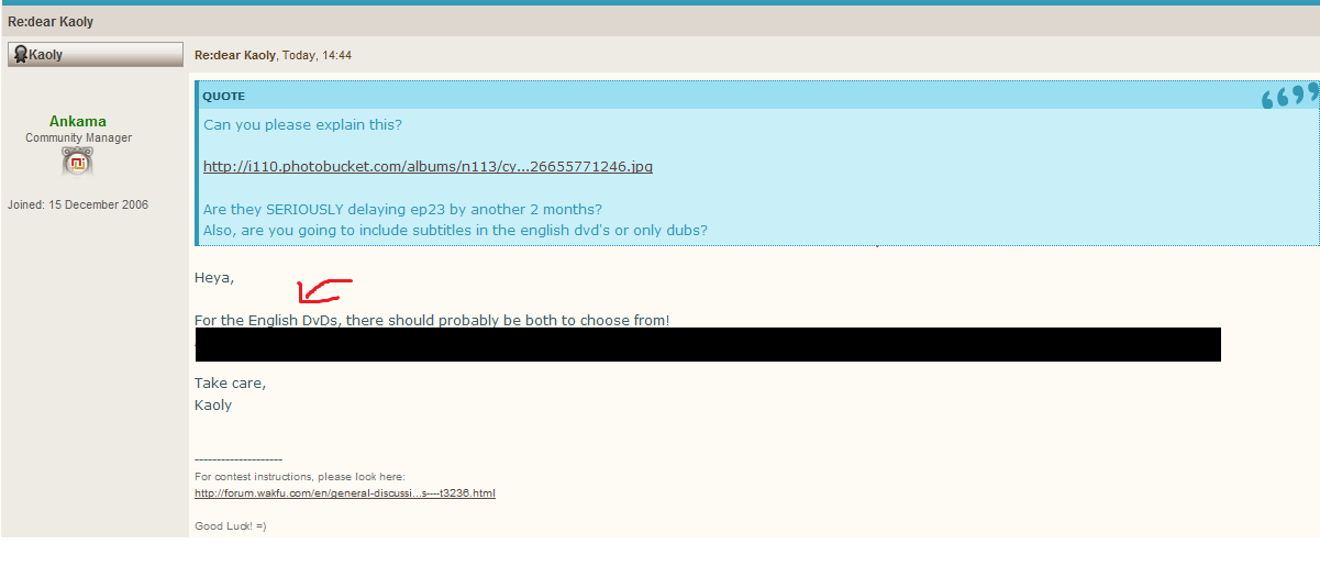 So, sorta good news ....Ankama's boss, Tot, posted a few message on their forums to calm down all the shitstorm with the postponing of the end of the season by France 3.Among all the explainations and apologies, he mentioned something nteresting.He said that they'll have a team meeting next week to decide what to do in order to help the wait and apologise for the inconvenience. Among other things, releasing the Goultard special episode might be an option. ("might" being the relevant word here, no promises yet)For those who speak french, here's the source :http://forum.wakfu.com/fr/index.php?s=&showtopic=63359&view=findpost&p=843678(messages # 205, #214 and especially #220)