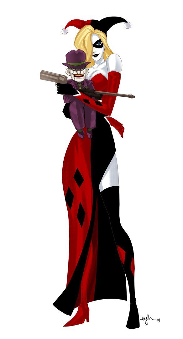 Then there's Punchline's right hand girl and possible love interest, the Scarlequinn. Pic related.original backstory was that she was the main act at a popular comedy club, when one day she invited a pre-Punchline Punchline on stage. when he was booed offstage, Scarlequinn was furious. Shit happened, sided with Punchline.My version- Scarlequinn was the daughter of one of Gotham's biggest, meanest, and wealthiest mob bosses. Jokingly nicknamed "Scar" due to his clear complexion and handsome face, the mob boss made a name for himself for doing anything to protect his only child and his business. One day, Scar is gunned down in front of his 12-year-old daughter, causing her to go a little crazy, wandering her home for days in a sort of trance, her father's empire crumbling around her, until she finds a beautifully handcrafted ventriloquist dummy stashed away and forgotten about in some chest somewhere in the house. Thinking it resembled her father, Scarlequinn picked up the doll and put all her memories into the doll, in essence giving it a life of it's own based off the original Scar. Through her "father" Scarlequinn re-forged the criminal empire through more cutthroat antics than her father could ever dream of. Now the youngest and truly most ruthless mob boss in all of Gotham and most of the surrounding area, Scarlequinn set out to recruit some major players- beginning with Killer Bane. Now, before I continue there, I'll move on to when she meets Punchline. When she hears of a fast thinking, joke-loving, riddle leaving madman, Scarlequinn seeks out this man, believing he would be vital to her criminal empire. When she finally meets up with him, she instantly falls in love with the man's cunning and tenacity, and adapts herself to become more of a harlequinn-esque figure, hoping to catch this Punchline's eye. She then takes on the name "Scarlequinn" as both an homage to her father and this new man in her life.her powers are- a vast criminal empire stretching across several major US cities and few foreign ones, incredible deal-making and intimidation skills garnered from her charismatic nature, high level of proficiency with revolvers and pistols. Whether or not the dummy Scar is just a vessel for her fathers spirit or an incredibly convincing act put on by Scarlequinn herself is unknown, but the dummy does seem to have his own voice, thought process, and personality drastically different from Scarlequinn's. Since the two are never separated, this allows them to formulate plans and create ideas as two symbiotic partners, and the two always work together to accomplish the task at hand.