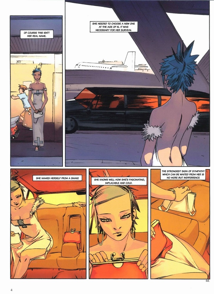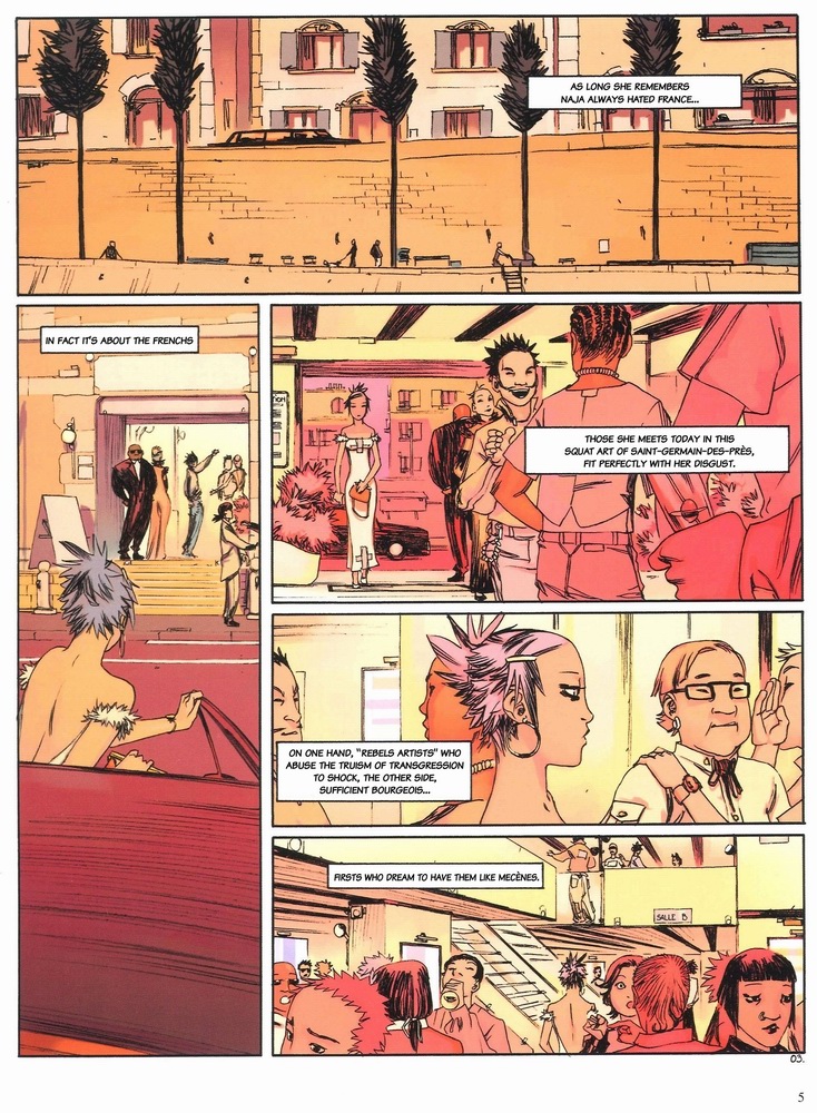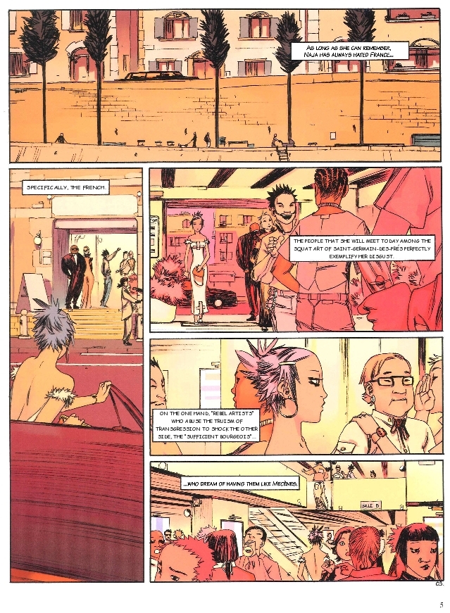 Edited translation by another anon:Page 1:Her name is Naja.Page 2:Of course, that isn't her real name.She chose it at the age of 15 as a necessity for her survival.She named herself after a snake.She is intriguing to others, and she is aware of this. Yet she is also implacable and cold.Her only outward emotion is indifference,Page 3:As long as she can remember, Naja has always hated France.More specifically, the French.The people she will meet today among this pathetic art on Saint-Germain-Du-Près perfectly exemplify her disgust.On one side of the room, there are "rebel artists" who abuse the conventions of what is transgressive and shocking. On the other side, the elite bourgeois......who dream of having them like Mecènes.[I don't know what this means, "them" is ambiguous here.]Page 4:They vote Democratic and think Republican.Are for change as long as it doesn't change them.Love the freedom offered by the relocating of slaves.The arrogant extremes of this country come together in this single stinking microcosm. It's almost laughable.But nobody has ever seen Naja smile.I know almost everything about her except for what is in her heart.[I'm taking some liberty here, and this might be contradicted by later narration. I don't know from your translation, "not if she has already made it one," what "made it" and "one" refer to.]