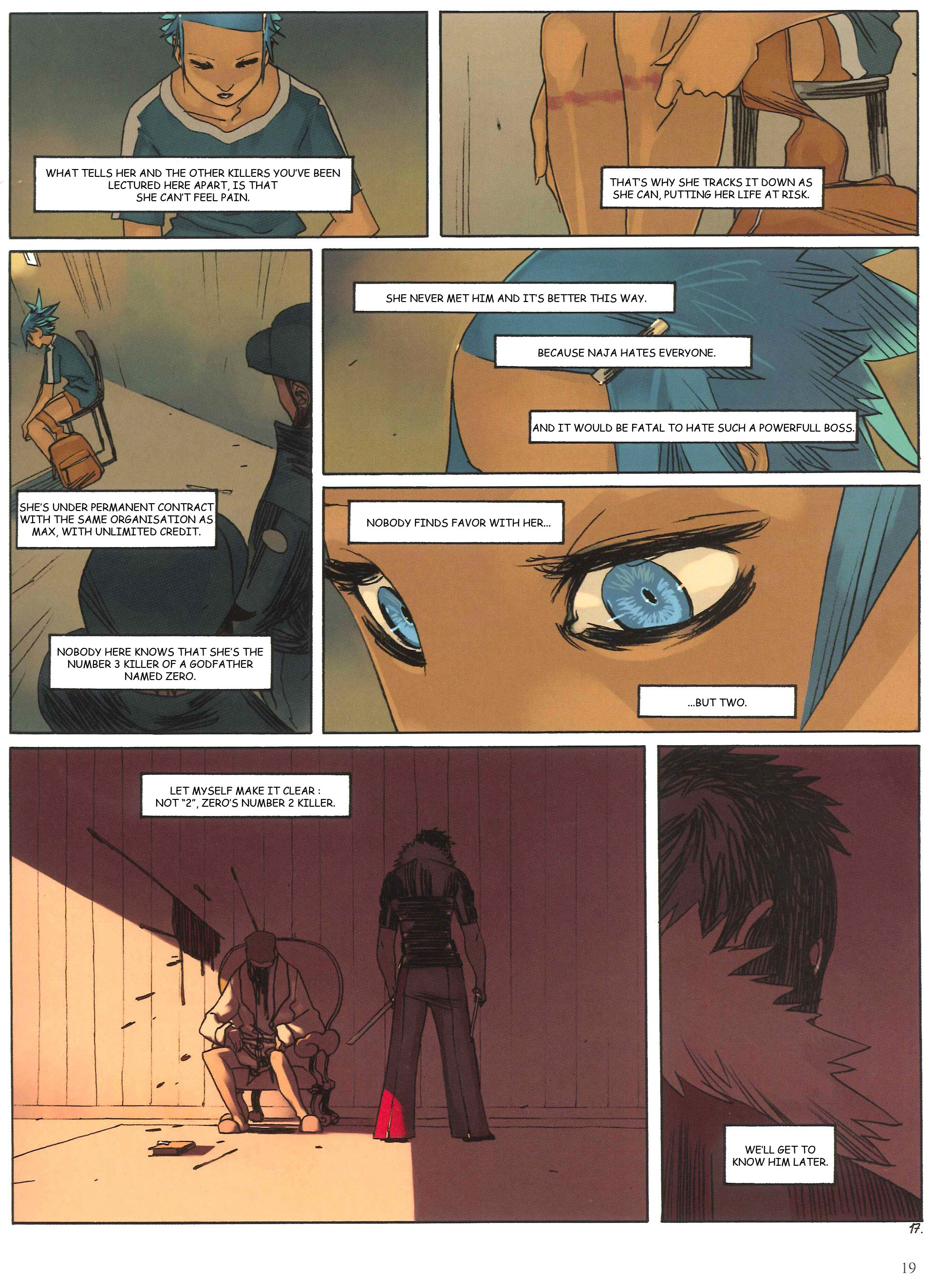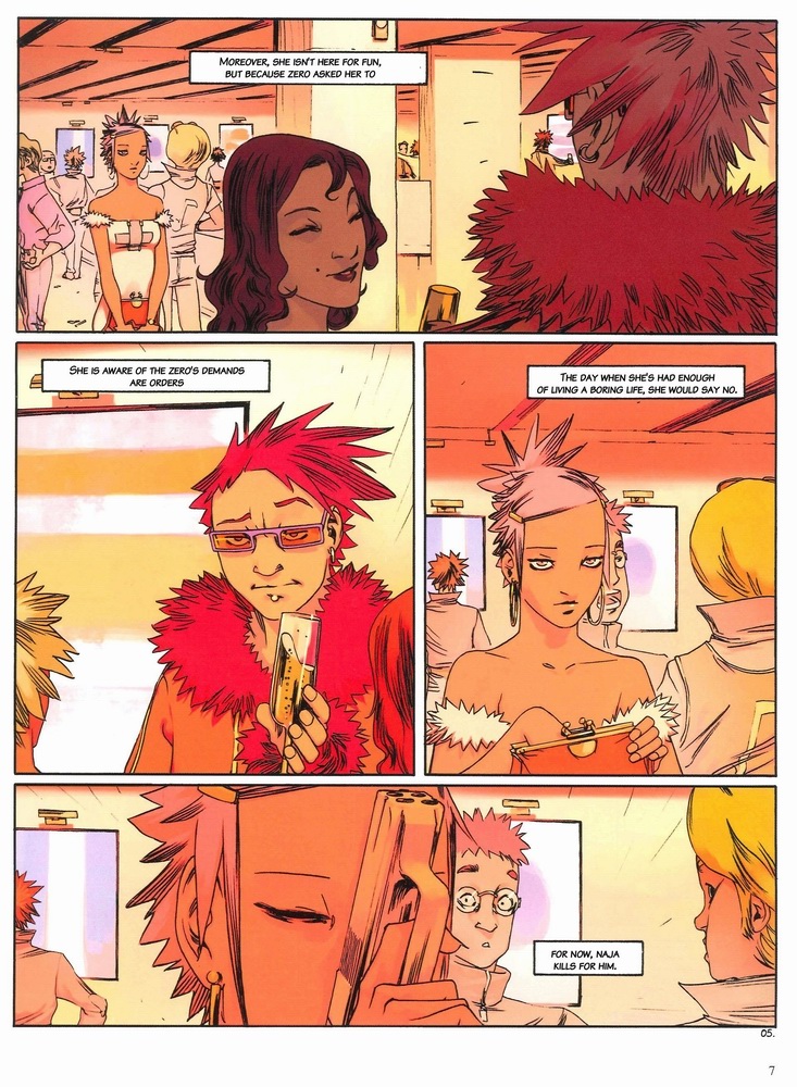 Page 5:Moreover, she isn't here for entertainment, but because Zero asked her.And she is aware that Zero's requests are in fact orders.The day when she's had enough of this boring life, she'll say no.But for now, Naja will kill for him.Page 6:She is Zero's Number 3 Killer. ["he" is ambiguous in your translation. In this context, it could also mean she is the third person to try to kill her target.]Page 9:Seen from the outside, we can only assume that Naja was lucky as hell to find a taxi in an alleyway.But the name of her luck is Zero.Zero plans in advance for all contingencies.He would be the ideal Boss......If he weren't a wanted, international criminal.