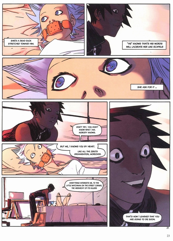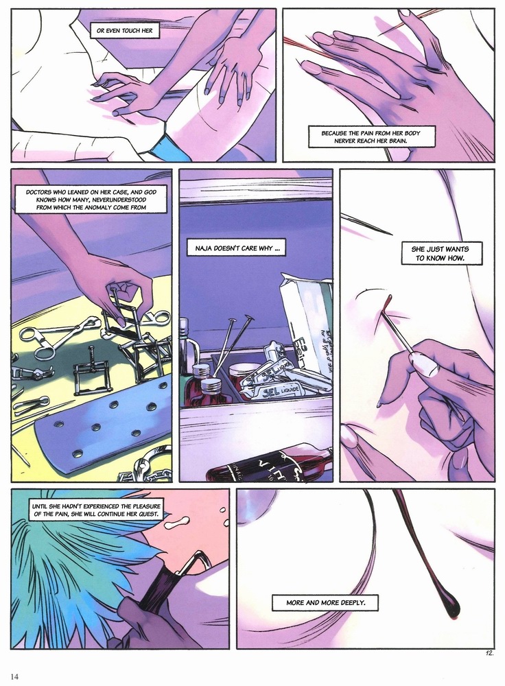 Page 10:Well, this man will be picked up by the taxi next. He will certainly make all evidence disappear.I am telling you, Zero plans out everything for the sake of his killers.All three, in their respective roles......are masters.One almost wants to see a little chaos in this beautiful mechanic.["It gives almost want to suggest the chaos in this beautiful mechanic" is ambiguous.]But this wish isn't expedient at the moment.Let's get back to our Number 3 Heroine.Naja isn't surprised by her master's gift.Because almost nothing surprises Naja.Page 11:Or even touches her.The pain inside her body never reaches her brain.Doctors who have learned of her case - God knows how many - have never understood this anomaly.Naja doesn't care why.She only wants to know how.Until she experiences the unique pleasures of pain, she will continue to pursue it......deeper and deeper.Page 12:She will not suffer her lack of suffering.["suffer, not to suffer" is unclear]She will achieve it at whatever the cost……even if it is death.