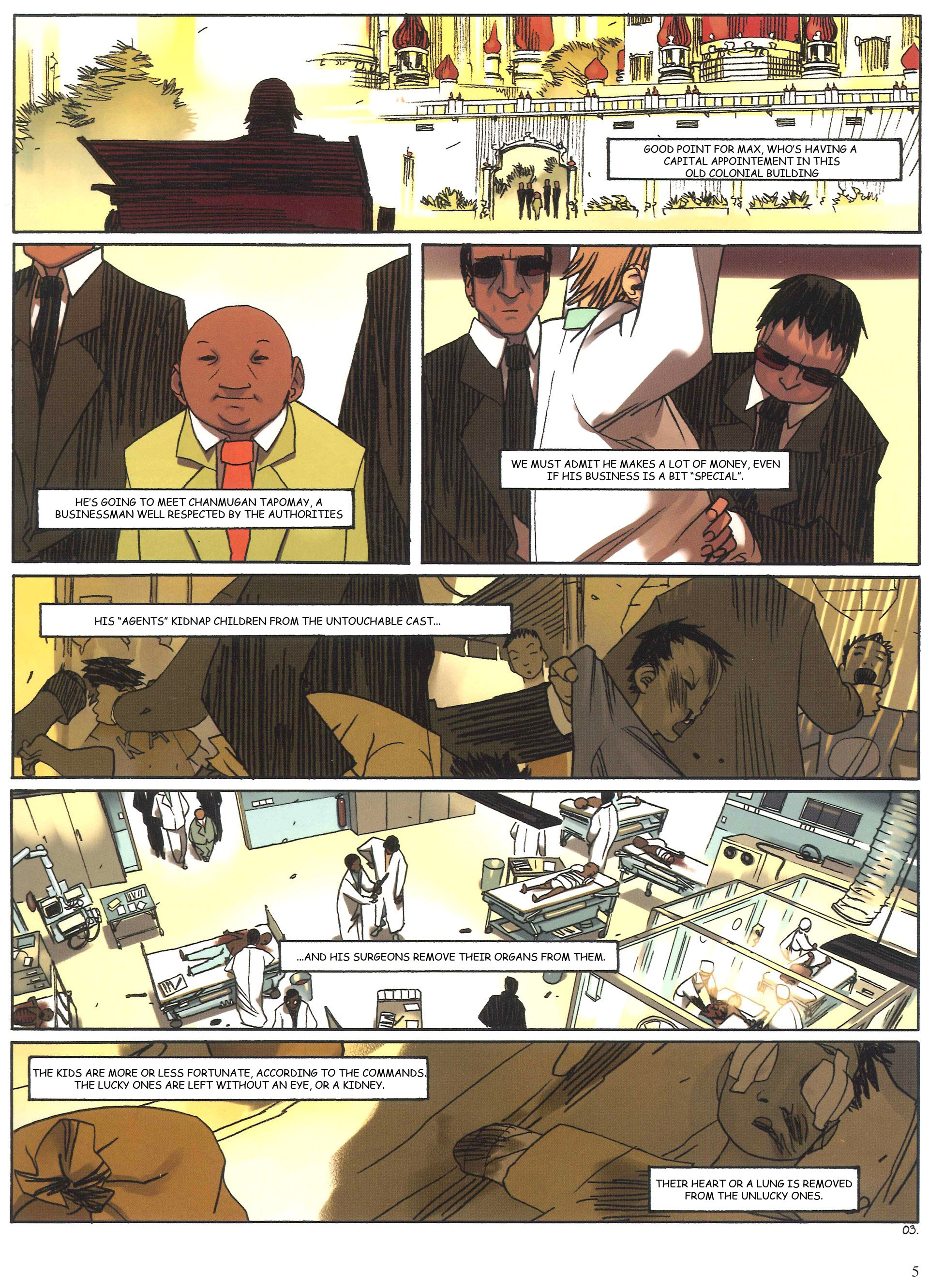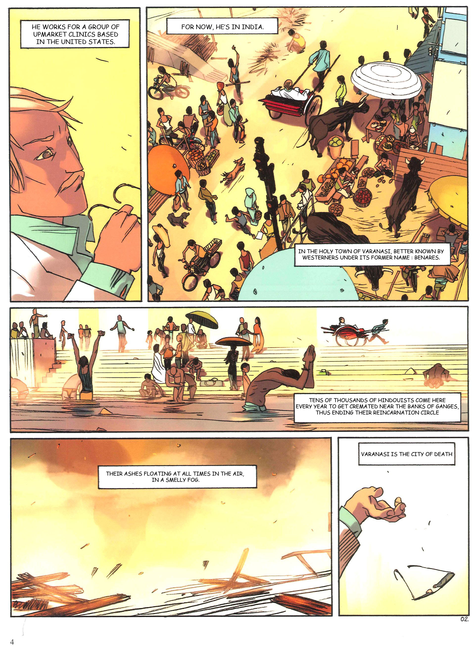 >>30638Whoops, thanks for pointing that out."Tens of thousands of Hindus come here each year to be cremated along the banks of the Ganges, putting an end to their cycles of reincarnation.">>30639Page 3:Hmm. How about, "This is certainly in Max's favor, as he goes to his appointment with a very important man in an old colonialist building."Page 4:I was confused by that. I originally translated it as Arab Emirates, but Page 2 says he works for people in the United States. These are both covers, right, so why the inconsistency? Your correction works."To get an appointment with Tapomay, Max has pretended to be the new middleman of a billionaire from the United Arab Emirates."