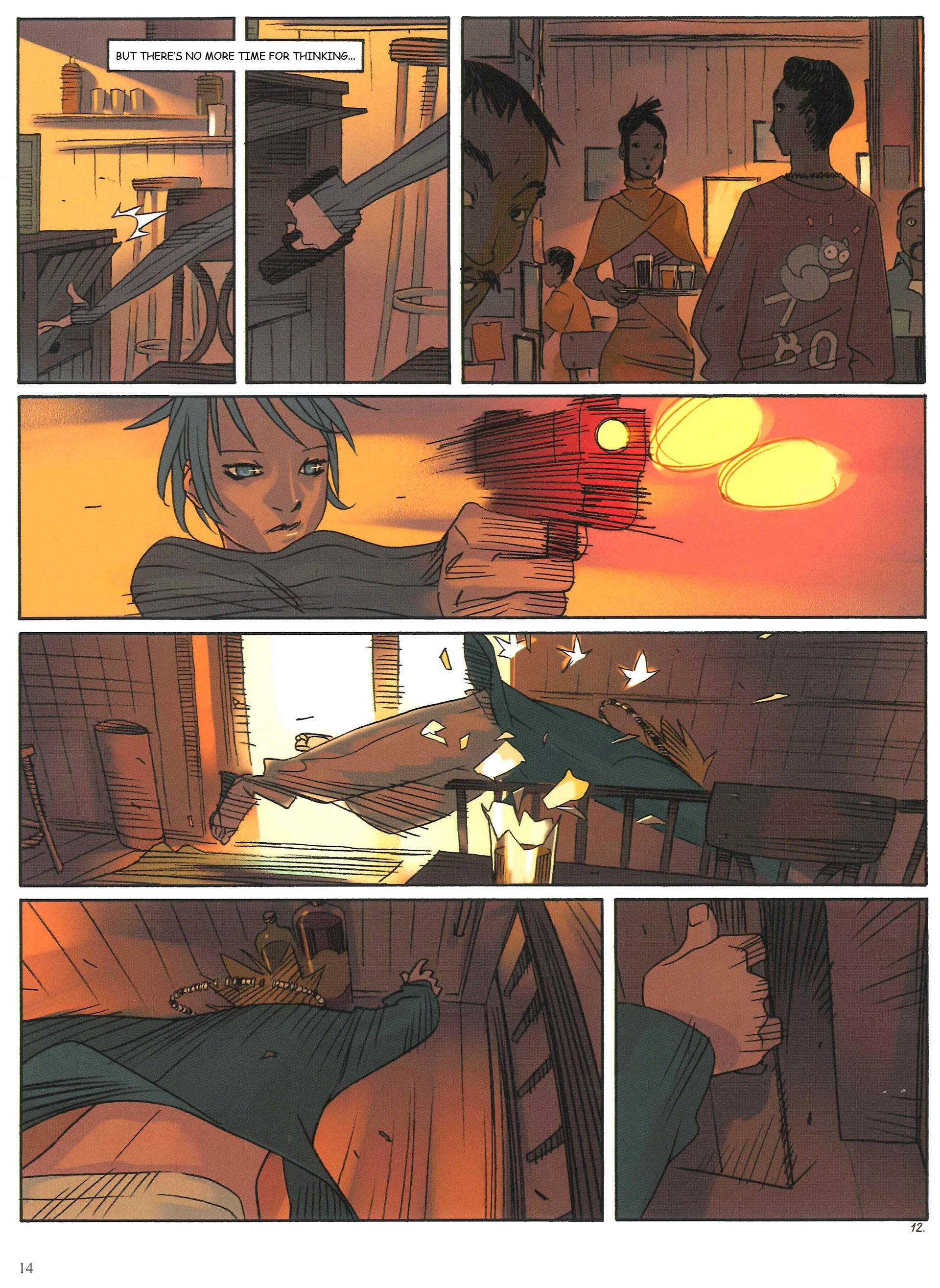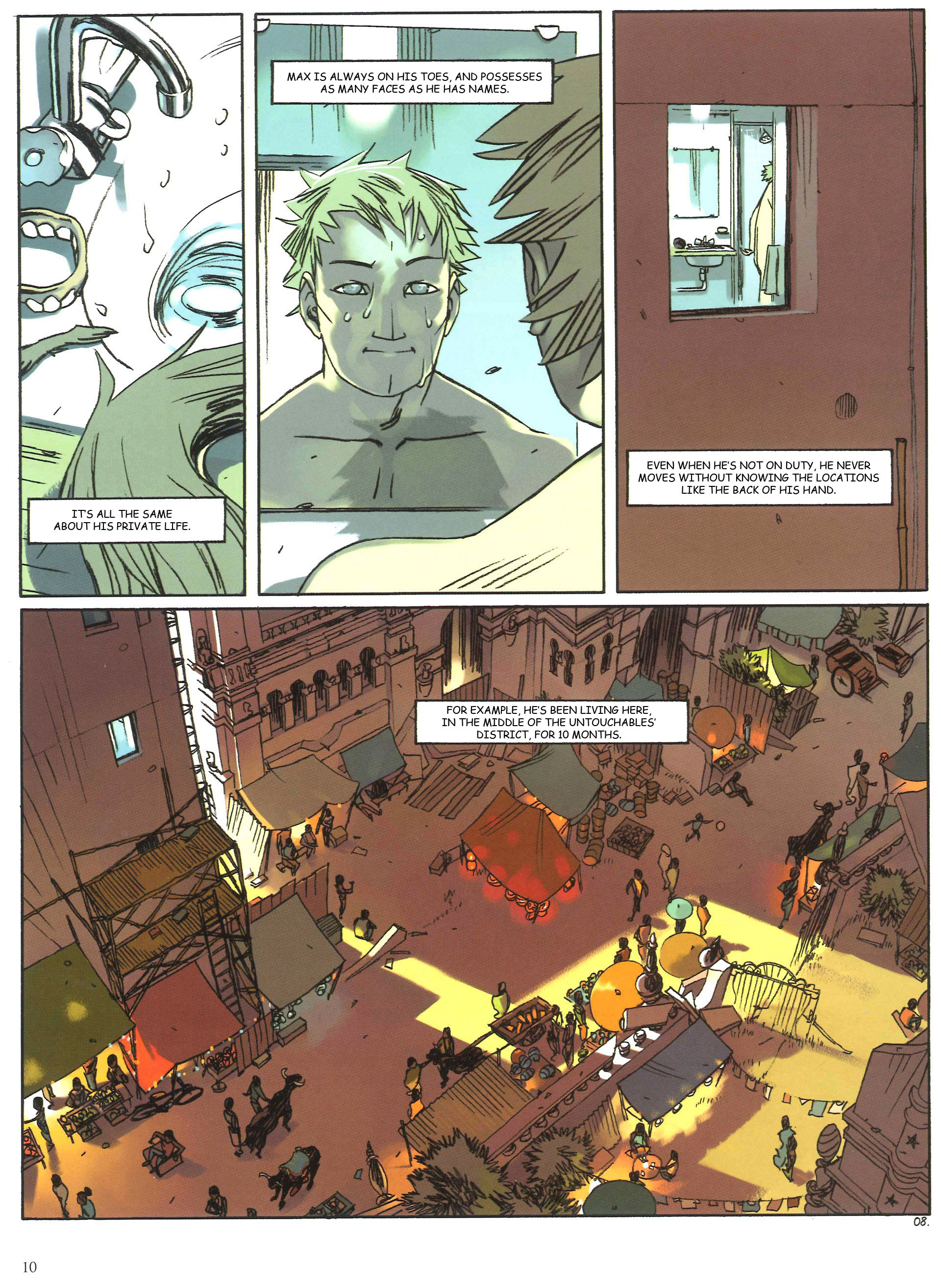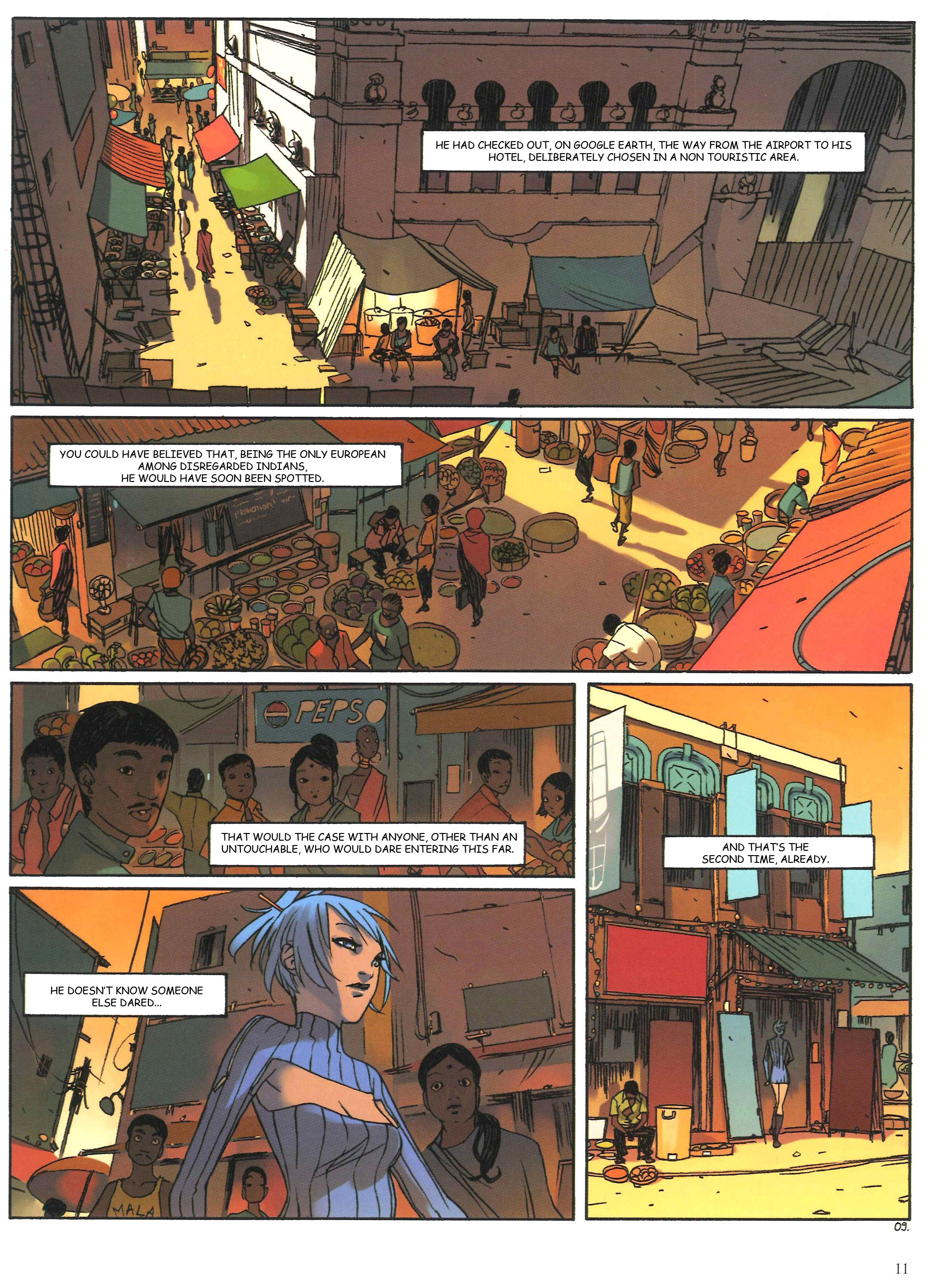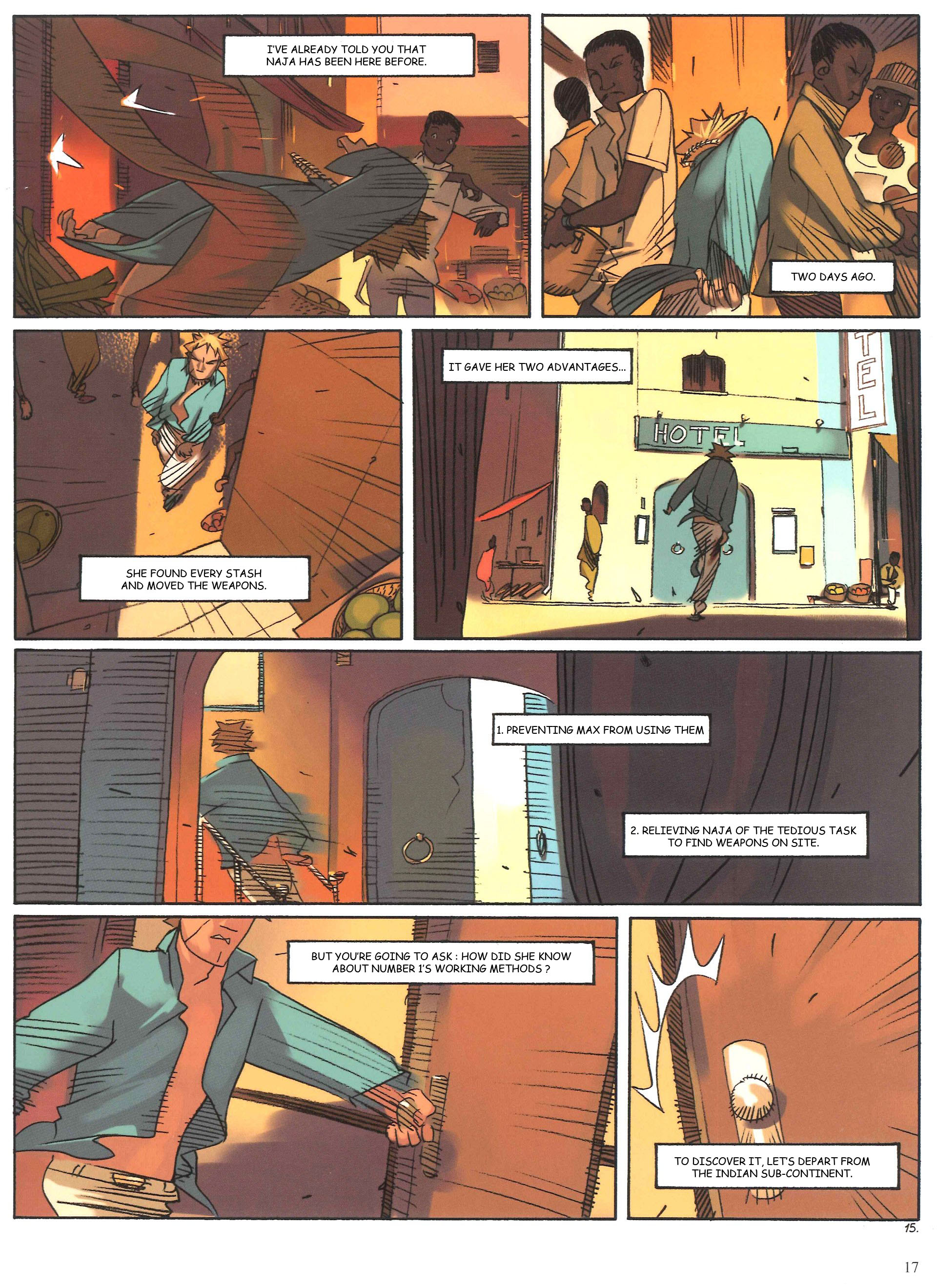Page 9:He mapped out on Google Earth the way from the airport to here, this least likely of hotels.You may question why he wasn't quickly spotted, being the only European among these demoralized Indians.But what kind of person, other than an Untouchable, would dare delve so far into this kind of place? [I'm a little shaky on the meaning of the translation here.]He doesn't know that someone else has dared……And that today will be her second time.Page 10:Max carefully visited all the rooms on his arrival, selecting the one most conducive towards an escape. Just in case.Then he discreetly inspected the whole hotel from top to bottom, secreting away a few tools for occasional use.Then he wandered around his new place, striking up conversations as he went.His open nature and magnetic personality easily secured a few friendly contacts.He was quickly welcomed in, and became friends with everyone.Max is really the most pleasant of killers.Page 11:So much so that Naja would almost question her decision to kill him.Page 12:But she has no more time for thinking.