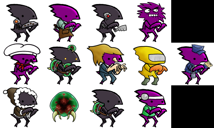 here's how they actually look >>31803 the only one of yours i've done is the doctor... in fact, i've been avoiding doing the space pirates, trying to finish the 256x256 tile list first. if you would pixelize your pirates it'd be great, i'll handle the metroid