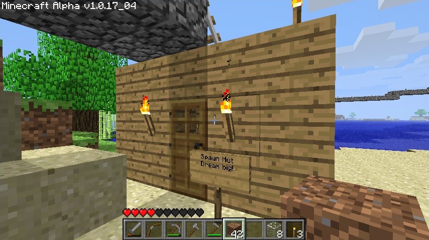 Such humble beginnings.And now I don't even use the hut anymore now that the highway provides relatively safe transport from the hut to the other buildings.The game's fault for always spawning me on the roof rather than inside.