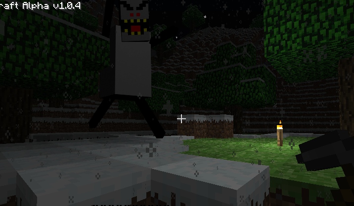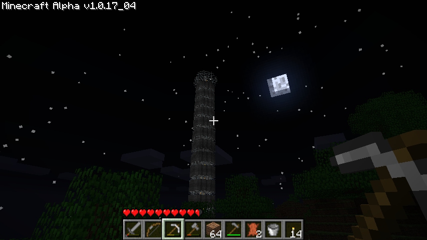So what do you think, /cog/? Can it be done in Alpha?It would be easy in Creative, what with the omnipresent light, and the ability to use obsidian, but...I'm thinking it could be a hollow cobblestone sphere, the black squares being where there's nothing/glass on the face, giving a small window into the dark sphere, giving the illusion of blackness, while lava provides glowing eyes, and iron blocks, the teeth, but...if it's staring down at you, how do you see the details? It would provide shade for its own face, making it look like a huge black circle.But if you dotted it with torches to illuminate it, well, you'd be able to see the torches, and that is lame.How do?