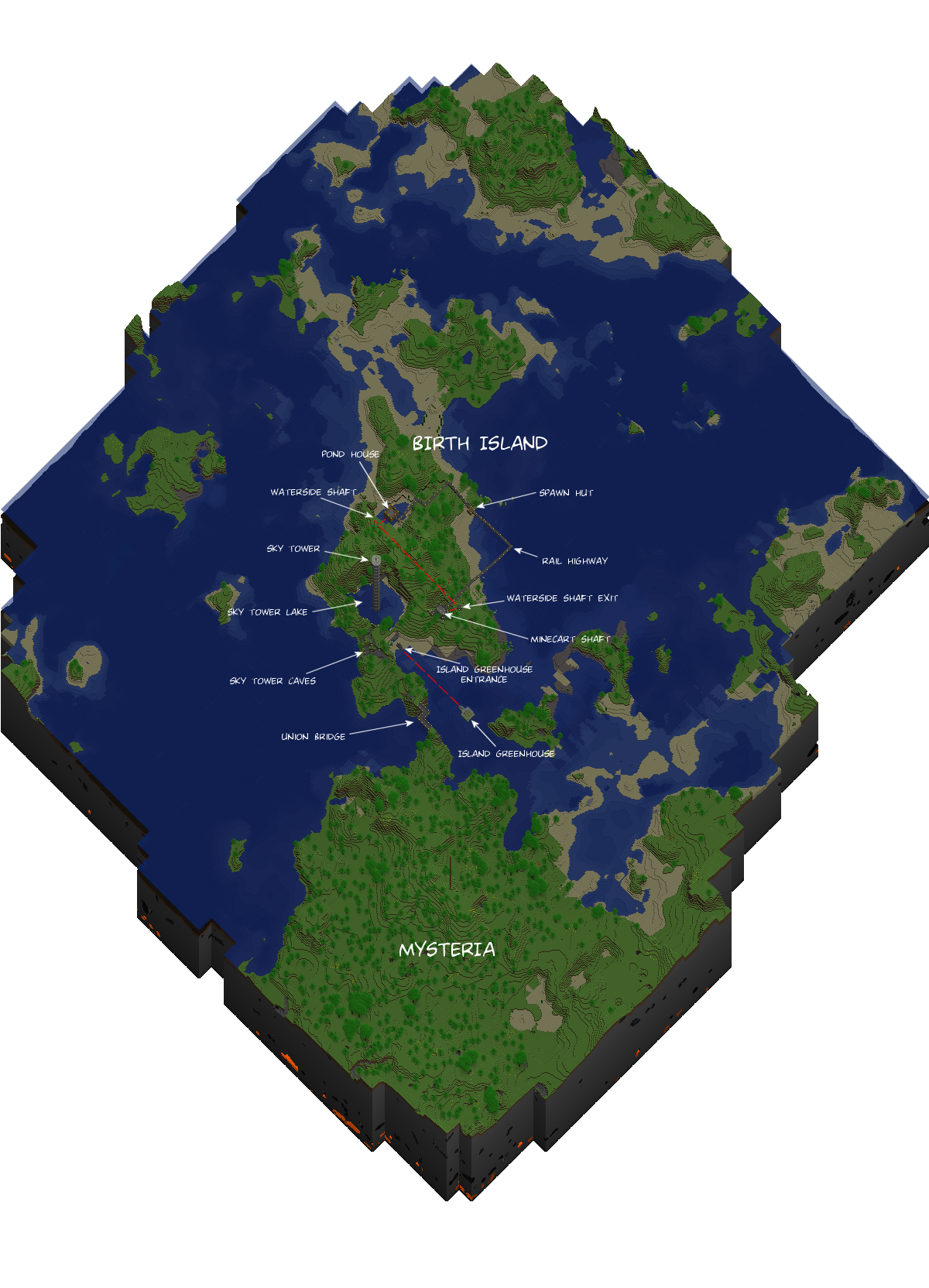 This makes me want to rebuild my island, but this time make the rail bridge connect directly into the minecart shaft's rail to the bottom, and then go to a second minecart shaft to climb back up and connect to the pond house to create one big loop.