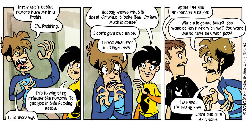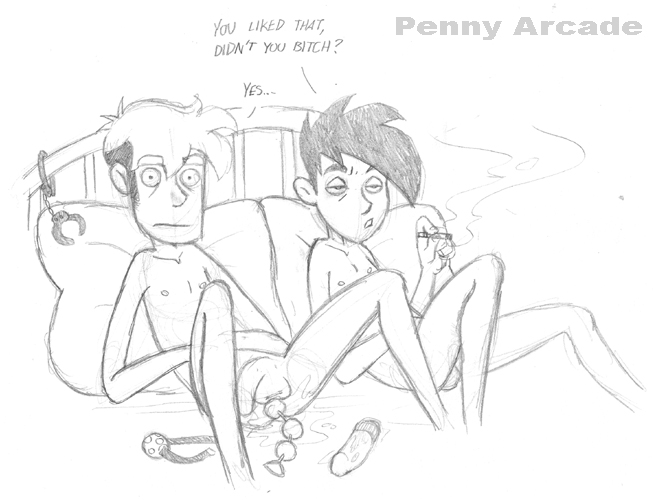 >>10926I've got this one. And... I think I remember one of them in bed, Gabe looking smug, and Tycho looking shell-shocked, with some used-looking toys. Sound familiar to anyone else?
