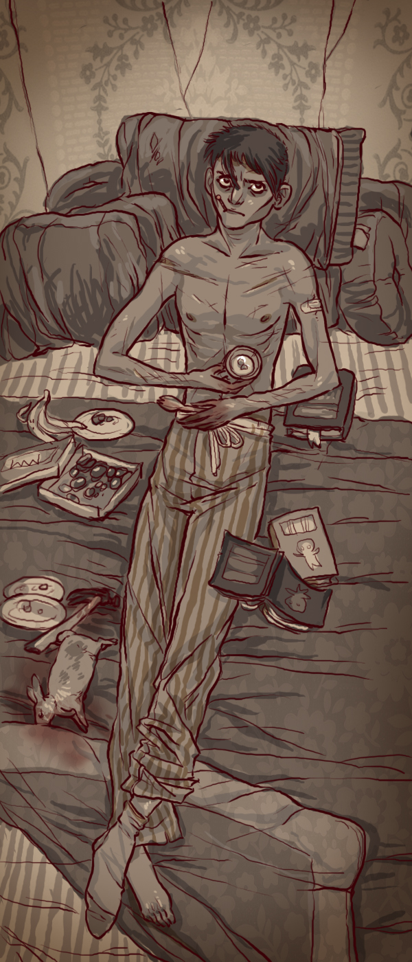 got fired today, /coq/. celebrated by getting drunk and finishing this fic. ta da.this is intended to be SWAN/ISH life 2, but I guess it could be any 'verse in which Edgar lives and inexplicably (suicidally?) becomes friends with Johnny. probably glaringly inaccurate in terms of LYX's canon (pretty sure it's been mentioned that the doughboys weren't as active in life 2, just for example) but this is how it came out. and sorry, guys, but there is no porn. they.. really don't lend themselves well to it. but anyway, content, let's get to it!---"He's here again," Nailbunny says suddenly as Nny's in the middle of painting. "He knocked." Of course he did. Edgar always knocks now, ever since he learned what the doorbell's hooked to. And then, since Johnny is downstairs more often than not and can't hear him knocking, he comes in anyway. He still knocks, though. Johnny doesn't feel like analyzing it.It takes him twenty minutes to finish with the fresh coat. He takes his time. It needs to be done right. He grabs a rag to wipe his hands on his way up the stairs. There's no sense in freaking Edgar out more than necessary; the face that Edgar makes when he's nervous annoys (angers bothers disgusts) Johnny more than the bother of wiping his hands, and he hates being covered in any kind of fluids, his own or otherwise. It's nothing to do with courtesy, simply convenience. He doesn't like being covered in blood, Edgar doesn't like seeing him covered in blood, it just happens to work out for them both. He'd be wiping his hands anyway. Eventually.In the back of his mind, Mr Eff laughs.Edgar's watching TV when he gets upstairs. "Hey," he says. The commercial with the talking fish is on. Not a great one. "You didn't miss anything good." Nny sits and Edgar looks over at him with a smile. The smile dips briefly, and his hand reaches out, aiming for the top of Nny's head. Nny ducks back reflexively, staring at Edgar's hand, which freezes mid-reach. Edgar's expression flickers- was that fear? amusement? Johnny can't tell- before settling into something rueful and self-deprecating as he draws his hand back. "Sorry. You've got…" Edgar gestures at his own forehead, and Nny mimics him, something wet and still slightly warm slicking over his forearm. Would Edgar have wiped it off himself, if Nny hadn't flinched? Nny is disgusted (with the very idea with himself with the blood on him with wanting Edgar to touch him with the thought of being touched with Edgar with the situation with the closeness with the distance with Edgar's refusal to see with his own need to have Edgar see with the blood with Edgar with himself Edgar fear hope hatred the wall himself everything) but distantly, the rest of him focused elsewhere. Edgar had reached for him- Edgar had- what did it mean? Can he see? Does he know? Johnny stares closer at him, trying to find it. Was it in that look, the face Edgar had made before pulling away? Does he understand?"He never will, you know," Mr Eff sneers at him. "He will never see. And if he ever does, he'll only run. If you think a bit of blood on your hands disgusts him, oh, just give him a hint at what other depravities you'd stoop to. You may as well kill him now, before you lose what little perfection there is to be found in this." "He'll only disappoint you in the end," D-Boy adds, mournful and mocking. "They always do. He'll be no different. Why linger, why prolong the inevitable? Forget him, Johnny. Forget them all. Nothing in this world is worth your time. Leave it behind.""They don't like him," Nailbunny says, comparatively quiet, almost whispering. "He makes them worried. He wouldn't run. He came back, didn't he?" He did come back, it's true. It's also true that he didn't exactly have a lot of other available options, but still, he came back, and keeps coming back. That probably means something, though what, Johnny's not sure, and Nailbunny's gone quiet again.He focuses back on Edgar. He's not sure how long he's been staring, but Edgar's still looking back at him, apparently fine with being stared at. It makes Johnny angry. "Why do you do that? How can you just- why do you just SIT there?" he snaps, detached to hostile in .5 seconds.Edgar's eyebrows raise. "It's a nice couch." It isn't; it wasn't even when it was new. "I don't mind," he adds, answering what Nny was actually asking. "You looked like you were thinking. It doesn't bother me." At this, he turns away at last, looking at the TV while Nny looks at him in disbelief. Being stared at for an indeterminate amount of time by his best friend the homicidal maniac doesn't bother him. Sometimes Nny really and truly does not understand even the smallest thing about Edgar Vargas. For a moment Nny wants nothing more than to kill him, and even he isn't sure if it would be out of annoyance or contentment. Edgar doesn't mind Nny staring at him. This is stupid. But appealing.As he's trying to work out whether or not he wants to go for the knife in his boot (or the one under the cushions), Edgar interrupts his thoughts with an "Oh, hey, Nny!" and an abortive move of his arm that might've been an elbow nudge if Edgar had been with anyone else. Johnny looks at the TV, shifting around on the sofa to watch better once he realizes what's on. It's the commercial with the kid foaming at the mouth. Definitely a good one.Johnny is starting to suspect that Edgar has learned to recognize his "someone is about to die messily" face and begun distracting him accordingly when necessary. He's too busy laughing to care right now, though. He'll deal with it later, if he remembers.Edgar falls asleep on the sofa at some point. He's never done that before, probably out of whatever lingering self-preservation instincts he has. It's too familiar, too settled, and it makes Johnny itch, and he probably starts getting that face again.Edgar must've been really exhausted, to fall asleep there like that.He should check on the wall.Johnny goes back downstairs, and leaves Edgar s