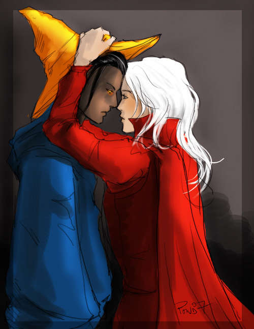 “You hit me with some sort of muddling spell, didn’t you?” B tries to roll away, knocking some dastardly-looking apparatus to the floor. Just what he’d be doing with that in bed, Red Mage is sure he doesn’t want to know.Somewhere near the bottom of Red Mage’s second cup of ale, this seemed like a fantastic idea. Round about the fourth, he’d felt rather like he’d die if he didn’t. B had seemed fairly amicable about the whole endeavour until he’d come to the apparently startling realisation that Red Mage’s concept of sport had very little in common with his.“B, really, you did say yes,” Red Mage says, the tiniest, deliberate hint of something darker in his voice, as he pins B’s wrist to the pillow. “You’re not going to tell me your word’s not worth half a copper gil, are you?”“Absolutely worthless,” B agrees. His hat’s been lost somewhere between the table and the bed, his hair no longer whip-straight but tousled, black and fine, spread across the rough-weave sheets. Even on skin so dark as his, there’s colour high in his cheeks, and his eyes beneath the soft glow are fetchingly dazed. “You’re a liar and a cheat, which normally you’d think would be something I’d respect, but-”B’s words turn into meaningless noise, his mouth still open but speech moderately impossible with Red Mage’s tongue in the way. He starts to kiss back before realising it, stopping abruptly.“Are you saying you’ve a measure of respect for me, then?” Red Mage asks, his lips wet and tingling, warmed by B’s breath.“I promise I won’t in the morning,” B says.