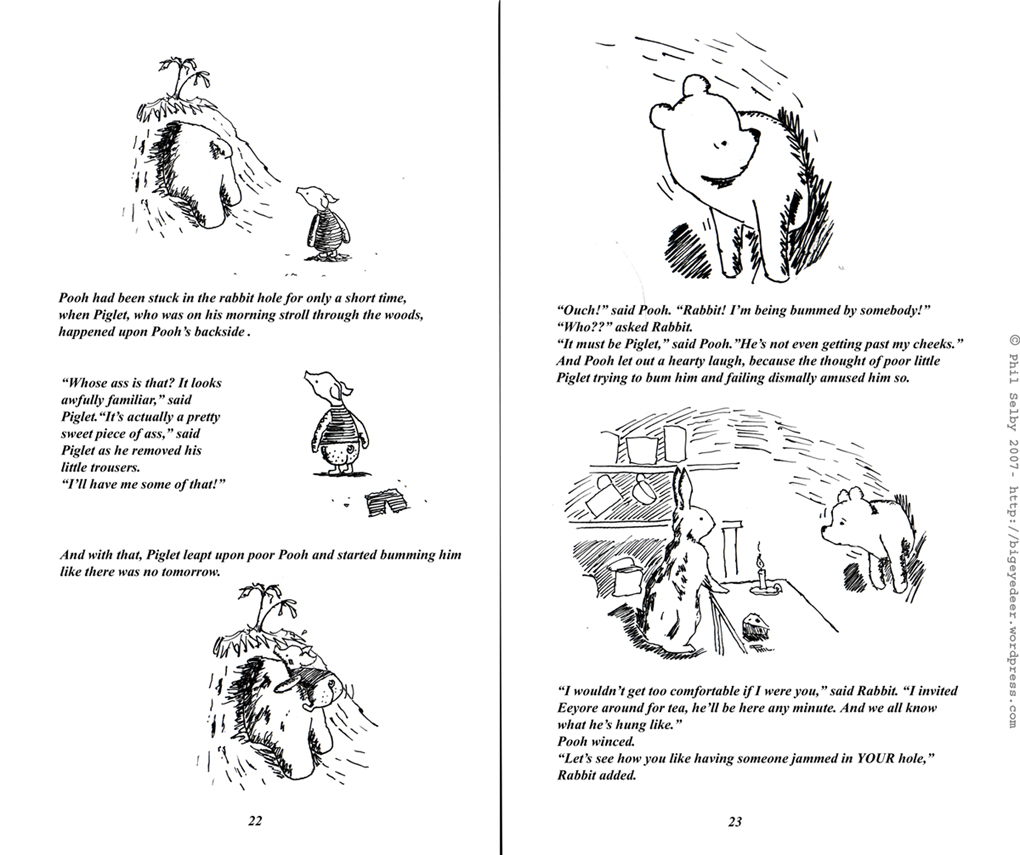 >>39177>and pooh let out a hearty laugh, because the thought of poor little piglet trying to bum him and failing dismally amused him soGotta admit I laughed too.