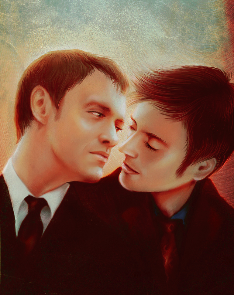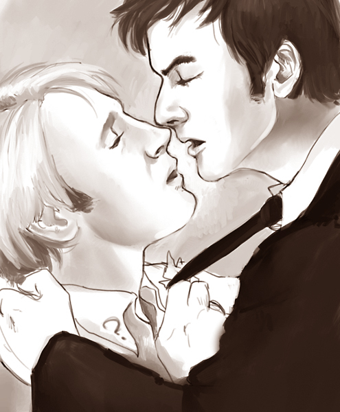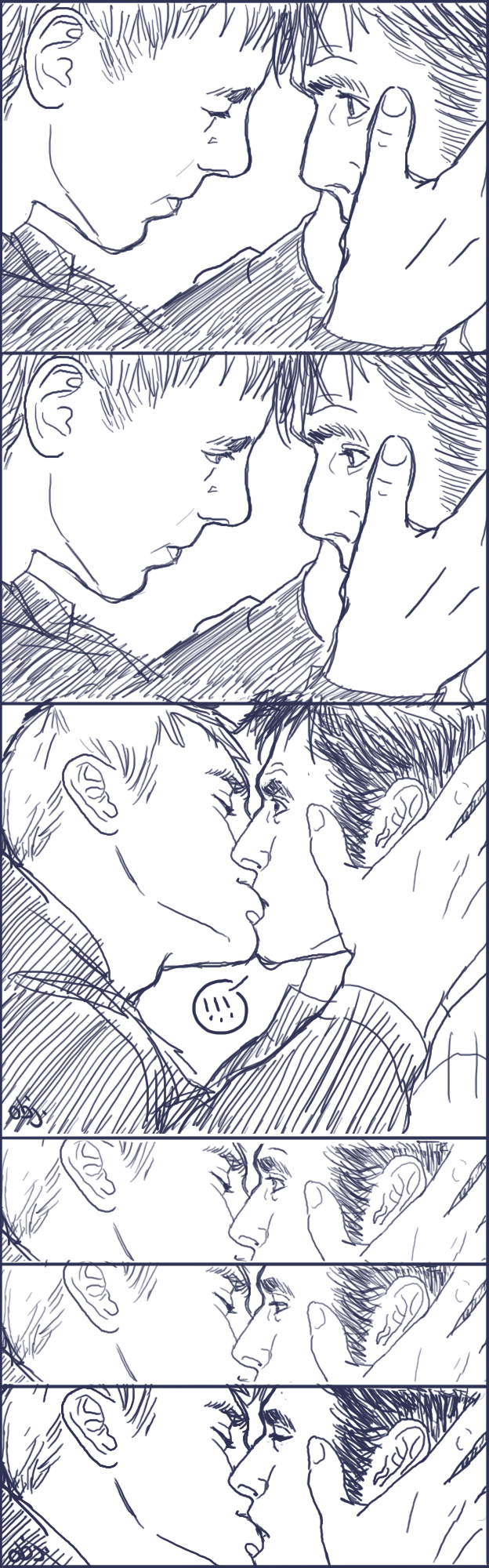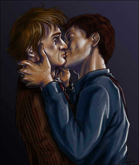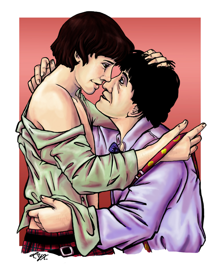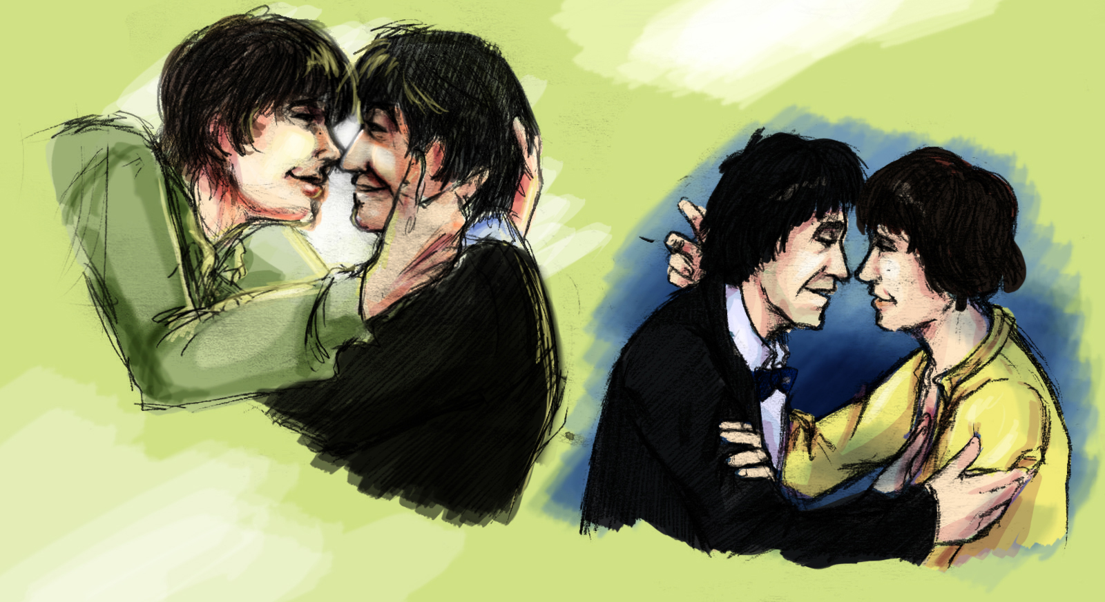 I DON'T HAVE ANY MORE DRAWINGS (by this artist) BUT FEAR NOT: they say they'll be doing more after they finish sketch commissions. In the meantime, I'll go ahead and post this fic I wrote. Hope it keeps you guys excited.Six point seven billion of them, all glorious, powerful and beautiful. I stare on in disbelief at the original, at the Master who is smirking in his usual way as he knows I’m frozen in some state of shock and fear. Six billion people, all now the same person, the very person that I loved and loathed, chased and changed with. It seemed an impossibility but when one spends too much time alone, one forgets that nothing with the Master seems impossible anymore. He approaches me with that stupid grin still plastered to his face, motioning for the three other Masters standing nearby to grab me. They come quickly and I try to slip away before their hands are all over me but I’m not fast enough, and now the three copies are laughing as they pull me away. “What are you planning? What are you trying to do?!” I scream back at the original, but he stands there smirking in his stupid hoodie, smiling at me like an innocent schoolboy. Before I try and struggle to get free of the hands on me, one of the copies slams my head into a wall and the last thing I hear is “Take him to the…” before everything goes black.I groan when I finally come to, unaware of what time it is—or, more importantly, where I am—and when I gather up the strength to open my eyes I find I’m in a secluded, plain room, with my wrist chained above me to a metal pipe. I try to examine the lock on the handcuffs, see if I can’t break them loose or not, but I can’t see very well from where I’m sitting and my body is much too cold to stand up. Oh, how typical of him. My clothes are missing, which would explain why I’m so cold but it doesn’t explain why he’s insisted on chaining me up in this empty room. By the time I hear footsteps outside the door I’ve made a few guesses as to the ideas he might have for Ways to Torture the Doctor. The door swings open and the Master bounds in like a gleeful little puppy dog, all wide-eyes and smiles at me. I remain curled on the floor and just stare at him, expecting some kind of maniacal speech. The hoodie-clad man kneels down so that our faces are level and he looks me right in the eyes and I see his smile quiver, if only just slightly before he stands and kicks me in the stomach.“I see you haven’t tried to escape. Those handcuffs aren’t the greatest quality but they were all I could find on a short notice so I hope you don’t mind.” He sneers with a sense of importance. The three copies that brought me in earlier line into the room, the last (who looks surprisingly stunning in that pink dress) locks the door. I clutch at my stomach, still pathetic and helpless on the floor as I look up to my ma—er, my nemesis. He kneels down again, whispering so that his copies can’t hear: “Now that we have that out of the way, why don’t you go ahead and be a nice little Time Lord and tell me where your TARDIS is, hmm?” I say nothing in response which only agitates him further. His palm meets my face in a harsh slap, and the noise echoes in the small room so that I can still hear it ringing in my ears like a drum when I turn to look back at him.“Come on now, Doctor. Let’s not be like this.” He says placidly, stroking my face with his hand tenderly. “Everything is going to be much easier if you just listen to your master.” He hisses, all of a sudden clenching my jaw in his hand, forcing me to look at him. Staring in his eyes, I could almost see the drumbeat echoing in his mind, controlling him. Commanding him. The Master, poor thing, has been controlled all his life, I realize. Whatever is in his head was put in there by someone, and I have a sinking feeling that the Time Lords may be able to explain it better than even he could. “I’m sorry, Master.” I manage to choke out just before his palm strikes me again. “I’m… so sorry.” I say again, almost relishing in the sting on my cheek. He’s sneering at me again, not exactly sure of what I’m talking about but I get the feeling that he doesn’t really care right now.He asks me again, “Where’s your TARDIS, Doctor?” and I only repeat my apology. I can tell he’s thoroughly pissed off by now, like he always gets when people—mostly myself—disobey him. Another swift kick to the stomach, ow, sends me kneeling over myself and spitting up blood. “Get him down.” He says with a distasteful and bitterly sharp tone to the copies standing at the other side of the wall. The one in the now-oversized suit comes over to me and unlocks the handcuffs, throwing them across the room carelessly. After I hear the clatter of the metal falling to the dirty floor I hear the shuffle and rustling of clothing—and I get that terrible sinking feeling in my stomach that I know what the Master is planning next. I sit back up, still coughing from the kicks, and see the three Master copies undressing just as I had feared. “No… please, no, damnit…” I mutter under my breath, no energy to scream at the blonde man’s face. I can feel him smirking at me again as I bow my head to spit more of the blood that pooled in my mouth.“Oh trust me Doctor, I won’t even touch you.” He exhales with a certain air of cleverness. Then I realize that he’s the only one still wearing clothing. Panic would be an understatement. I’m fully alert by now, not even tasting the iron in my mouth as I back myself away from the approaching Masters into the corner. “No, no, no, no, no, no…” I keep crying out, and when their icy hands grab at my skin it burns like the suns back home on Gallifrey and I can’t help but cry out and kick and scream and do anything I can to make it all go away. The Master, the real one, only watches smugly, leaning against the wall, and says, “Oh come now Doctor—I thought yo