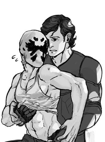 >>51322Walter fisted the material in his dirty hands before he dragged it on reluctantly. It was difficult to see with it on, but it wasn't too hard to breathe through. Immediately Dan was on him, pulling at the make-shift mask, adjusting it so it was just perfect. Walter resisted the urge to push him off. It was wrong - it was all sick and wrong - but what disgusted him the most was the small comfort it afforded him. It wasn't his face. It wasn't his face, clean and true, it was the gut-twisting fantasy of the man he fought exactly this sort of immoral degradation with on the cold wet streets of New York. It wasn't his partner that he could feel roughly pulling him from his vest like he was undressing a child. It wasn't his Nite Owl that dug his fleshy fingers into Walter's shoulders and his teeth into his neck as he was pushed onto the sagging couch - but it was the closest he was ever going to get. The other man came down with him, forcing the breath from him as he was pinned to the cushions. Through the fabric, he could see Dan adjusting his goggles before hurriedly sliding his pants off and into a heap on the floor where Walter's neat pile was now strewn. They clashed together in an ungainly tangle of bony knees and sharp elbows, with Dan straddling the masked man's narrow hips. He snatched his wrists with one strong hand and held them down above their heads before leaning forward to murmur in his covered ear. "Struggle," he hissed - his free hand on Walter's neck, his thumb stroking his adam's apple lightly before pressing firmly - and he did, suddenly feeling a little panicked. He hadn't expected it to go like this. He didn't know what he had been expecting, perhaps for Dan to be slow and gentle like he always was, but nothing like this. His hips bucked as he fought to gain some sort of wiggle room beneath his partner, as he could hardly breath beneath him. Ink-stiff cloth chaffed the bridge of his nose as his head was forced back suddenly, and teeth scraped against his vulnerable jugular with the intent to leave their mark eliciting a reluctant moan from the smaller man. Now Dan was struggling to free both himself and his guest of their underwear as quickly as possible, which was made infinitely more difficult by the fact he was unwilling to break contact with him. Waistbands snapped and slid, and finally they were uncovered - this time it was Daniel's turn to moan as Walter ground up against him urgently. He leaned forward causing the smaller man to snap his covered head sharply to the side, but he wasn't going to attempt to kiss him - that would have implied familiarity, affection, perhaps something other than pure lust and frustration. With the hand he had gently choked him with, he slid up the bottom of the mask and roughly jammed his thick fingers into Walter's hot wet mouth. "Suck," came yet another grunted instruction. The digits tasted faintly of sweat and motor oil even though they were clean, and Walter resisted them, pushing and fighting with his clumsy tongue. If he knew what Dan was planning to do with those fingers and what little saliva coated them, he might have been more compliant. He shifted, moving down the pale freckle speckled body beneath him. He had to let go of his wrists, but Walter didn't move - he was stiff, tense, shaking, craning his neck trying to see what Dan was doing as he moved into an inky blindspot. His legs were pushed apart with a growl as he tried to keep his knees together, feeling over-exposed and vulnerable as hands grabbed at his ankles, shoving them up and out. There was a mutter of something that could have been 'relax', and suddenly there was two fingers jabbed harshly inside him. Walter bit off his ragged moan, twisting and squirming at the itching burning sensation of being stretched without warning. He gritted his teeth as those slick thick fingers were scissored and he clenched as they hooked inside him, trying to arch away. Now that Walter was keeping his legs spread of his own accord, Daniel was free to leisurely stroke his own cock as he hungrily ate up every little detail of the scene before him. How would it happen, he though to himself. How did they get here, he and his partner? A tough night, a little close, humid - raining, perhaps. A gang of youths - of thugs - six or seven of them...yeah, seven, with weapons. Knives, chains, the works. They'd rough them up a little, it would come scarily close. Adrenaline pumping, hearts thumping they would stagger back to the owl-cave delirious and victorious. Rorschach...Rorschach would be wounded, ferocious, snarling like a bobcat, a wild animal...wild animals were /dangerous/, wild animals had to be /tamed/. Dan would tame him, make him squirm and moan just right before he lost too much blood, before he hurt himself. He'd tame him for his own sake, break him in, calm him down. He slapped away Walter's hands that had drifted down to tug at his neglected cock, pinning his shoulders down. He'd tame him alright, he thought as he thrust forward cruelly making the masked man cry out hoarsely. He'd show him who's boss for once. Without giving him time to adjust, Dan pulled out and slammed back in again all the way to the hilt, loving the noises it forced from his partner; gasps, sobs, grunts, strangled screams. It hurt, he knew that. He wanted it to. Through his goggles, he watched sharp features barely concealed by the pseudo-mask contort and scrunch with pain and perhaps even pleasure in fantastical colours and almost unreal detail. Convinced he could /see/ the bruised blush on those razor sharp cheekbones, the damp spot on the mask where his mouth would be, Dan's pace was starting to become jerky, erratic. He knew he couldn't last much longer, not with rough hands twisting in his hair, untrimmed dirty nails clawing welts down his back. With a last forceful shallow thrust and a throaty moan, he came so hard he swore he could see stars and his hands clenched around Walter's throat hard eno