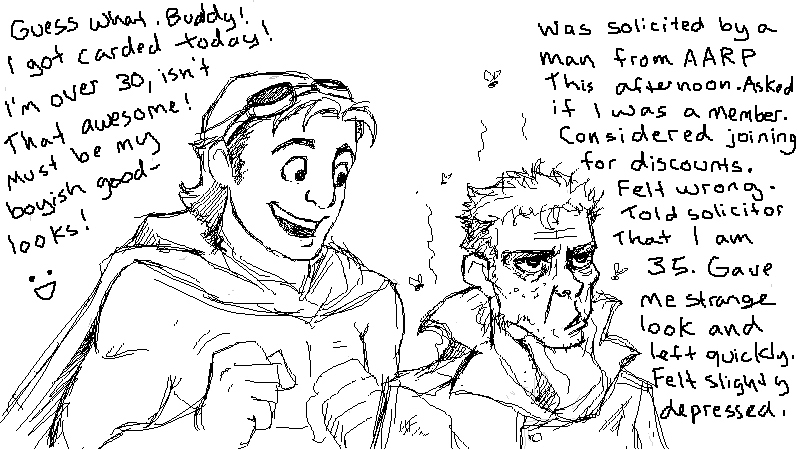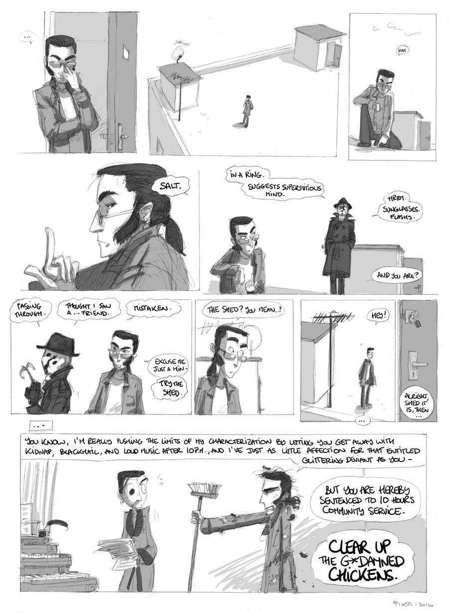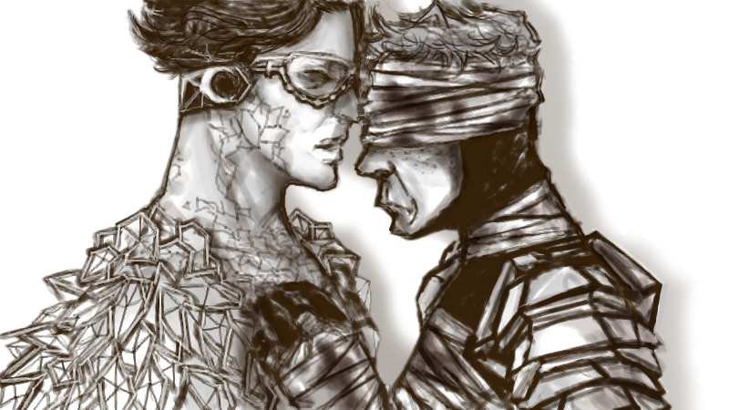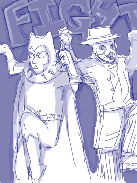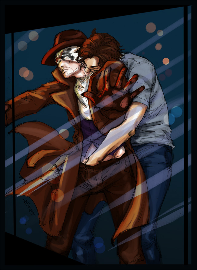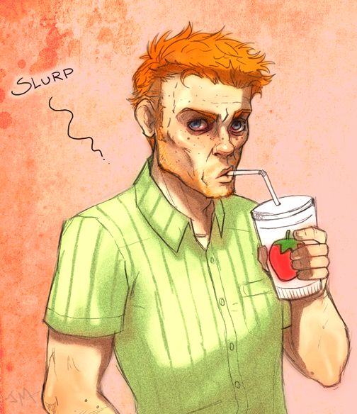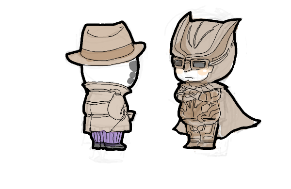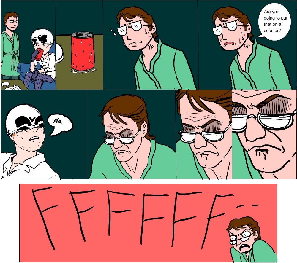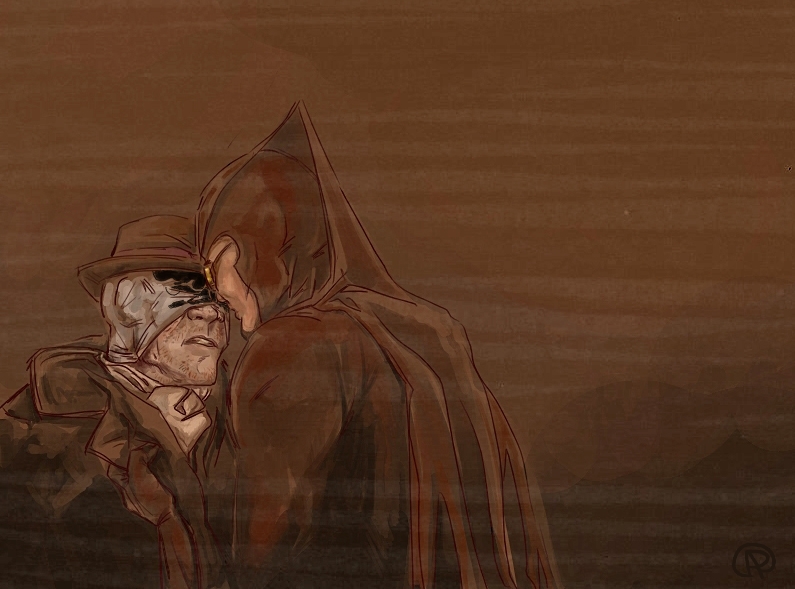 >>33530This is the fic that the picture is based off of. Never have been a more proud writer (even if this was sort of crack, written for kink meme)."Coasters NOT Optional"Nite Owl had challenged the tyrany of the Underboss, taken down criminals twice his size with twice the firepower. Hell, before Archimedes was ever in the picture, he was flinging himself across rooftops with a grappling gun and spring-soled boots (that had really been a bad idea, all things considered). He had never felt so close to death.It had been building up, really. It was only a matter of time. He had been pulling his hair out over the countless false alarms raised in the night from the clattering arising from his kitchen pantry. He woke up in the morning and there was no sugar for his goddamn coffee. Like a racoon- really, he couldn’t think of a better metaphor! Pawing through his inventory of canned goods, stealing away into the night without so much as a how-do-you-do. And just because he /had/ the money didn’t mean he /wanted/ to keep pulling it out of his pockets to keep repairing his door. He was beginning to entertain thoughts of having another housekey made, but then that would mean he was encouraging this sort of behavior.Then again, what did it say when he went out night after night without saying a thing to the perpetrator? Rorschach was there every night -unless he wasn’t, which Dan never got notice of- riding beside him in the hull of Archie or striding strong at his shoulder in the streets. Neither of them said anything about it, and Dan simply had to sigh and shake his head because he was just as an enabler. It wasn’t all bad, after all. Sometimes his partner lingered when caught in the act of poaching, sat at the table and humored Daniel’s attempts at casual conversation. Sometimes. Or they talked about the next big bust, the details of their next mission, which he knew the masked man was much more eager for. And that was pleasant.Lately, though, lately it had been trying Dan’s saint-worthy patience. Five nights in a row, they’d been chasing down a drug ring that seemed to be three steps ahead. Much to Nite Owl’s dismay, they had even taken the sewers in hopes of surprising what they had been led to believe was one of the higher up officers. Again, a little fish, a front man that knew as much about anything as the vigilantes. Another address to search, an abandoned warehouse to show for it. Even if he let Rorschach drag him through the streets until he was raw one breadcrumb after another, Nite Owl knew they were going to have to slip back under the radar again, wait for mistakes to be made. He knew it wasn’t what his partner wanted to hear, wasn’t something he would be convinced of through the same trivialities that made Dan want to throw his hands up.He awoke to the sound of his basement door hitting the wall downstairs, meaning his partner had taken the route into the lair. Probably had taken some tools too. Dan reluctantly rose from his bed- he knew Rorschach wasn’t getting any sleep over this. Infuriated, no doubt, that he kept being had. Couldn’t blame him, but something needed to be said.Daniel found him with a can of peaches in one hand and a can of Coca-Cola in the other, nestled in the crook of his downstairs couch. He had his mask drawn up to his nose, all square jaw and stubble and loud noises as he slurped the juice from the peach can.“Amastad another wash. Potential bases running out.” Was all he had to offer. He had a dog-eared map spread on the table before him, marks all over it where they had found information and crossed out every failure. Dan noticed they had increased substancially.“I’ll say,” Dan mused, “You’ve nearly covered the whole city.”“Necessary for success.”“Yes, desperation calls for drastic measures...”There is a tense silence. Rorschach chews on a peach slice with ruthless fervor. Schlorp schlorp.“Listen, Rorschach,” Dan sighs, feeling sorry for letting his exhaustion get the better of him. “They know we’re looking for them. Even the dumbest criminal can avoid an investigation if they know the roads we’re taking.”“So change course.” With the mask out of the way, Dan could see Rorschach was speaking through gritted teeth. He wasn’t going to let this go. He kind of had the pitbull thing going for him. But Dan wasn’t amused. He was tired and he was beginning to feel desperate for his friend.“We need to lay low for a while. Make them think that we quit.”“Hrn. But /they/ won’t quit.” He set the can of peaches down on the coffee table and cracked open his can of coke, taking long swallows and wrinkling his short nose reflexively as it burned all the way down. “Can’t let them win.”Daniel knew it. Somehow, Rorschach had gotten it into his head that he had something to prove to himself by persuing this case. Neither of them could possibly know it now, but things were going to get a lot worse in the future, the stakes would be much higher. Right now Daniel thought his partner was wound so tight he was bound to pass out from brain deterioration (from the man’s clear insomnia) all from clutching at coat tails. Rorschach was taking this way too seriously for his own good, but he was too damn ate up with it to see reason. And Dan wasn’t really good at being anything but reasonable when baring down his friends and colleagues. He was still grasping for something to say when Rorschach said it.“Don’t need to come. You rest, Daniel.”Maybe the masked man hadn’t meant it to be patronizing, didn’t mean for it to sound like he was implying Nite Owl step aside. But Daniel reared his head back like he had been slapped all the same, the words making him blink behind his glasses in rapidfire offense. It stings. He is a young man then, they both are, and he has his pride too.“You stubborn bastard, you’re going to be so dazed that /if/ you find them, they’re not even going to have to try an