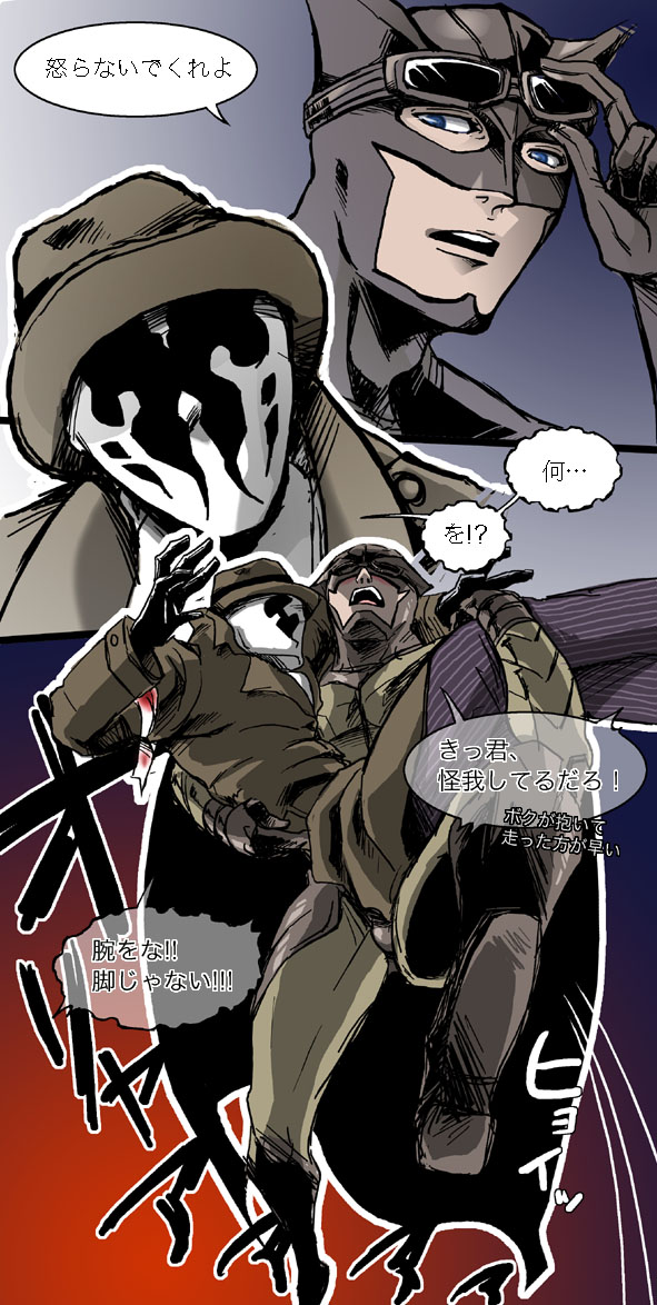 Dan: Don't get mad!Rorschach: Wha..?Dan: You're injured, right? It'll be faster if I carry you!Rorschach: Arm! Not leg!Dan, king of subtlety.