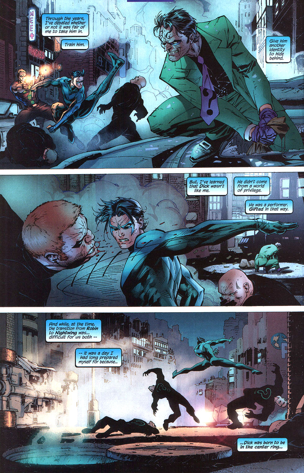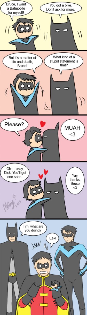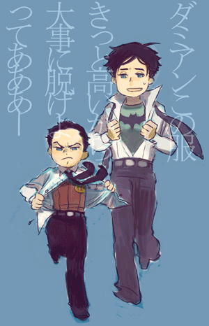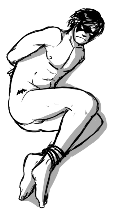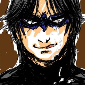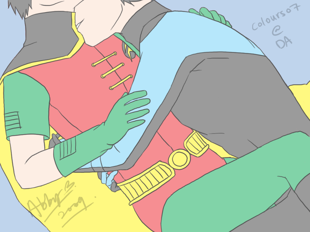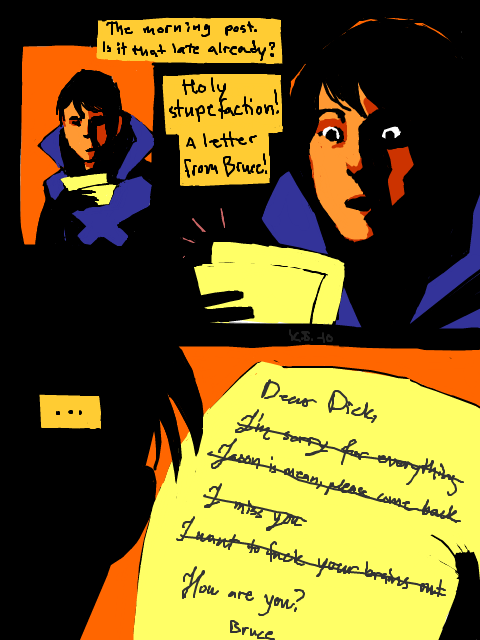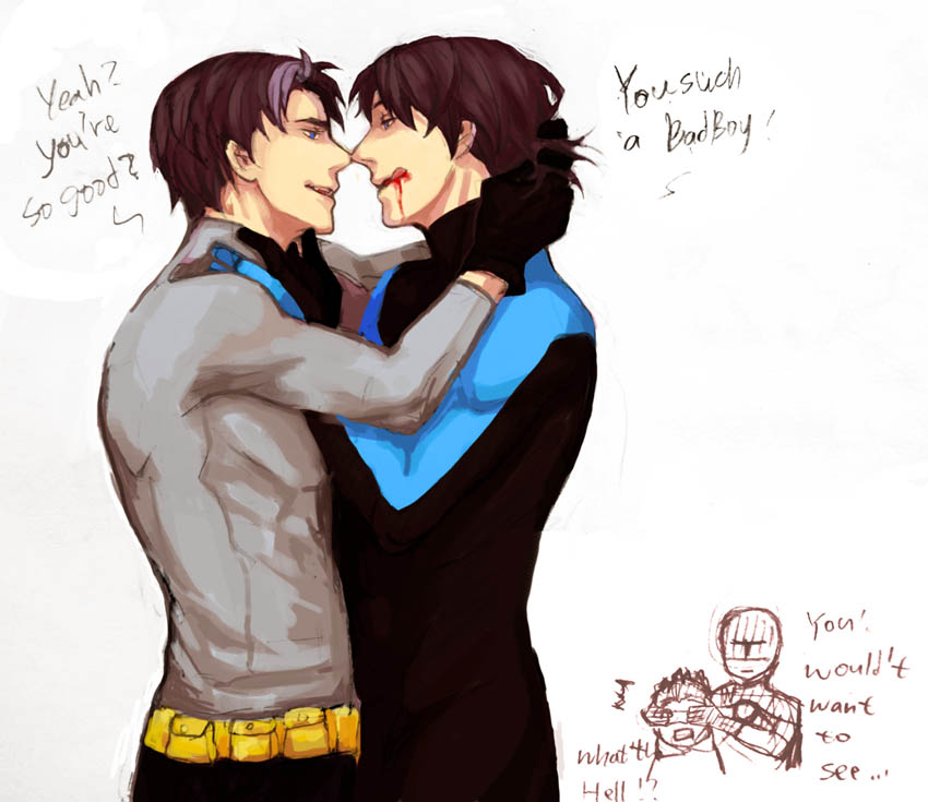 Dick/Bruce fic, featuring daddy issues and hot as hell Robin's mask scene.Dick catches the bank robber's wrist, clutching, spinning and twisting until he can feel the shudder of a dislocated shoulder vibrating through their point of contact. Shoves the man away with a blow to the back of the head before the inevitable scream is fully choked-off, and turns to the next. Catches a punch to the jaw and curses to himself -- he really should've ducked that one, and, dammit, he would have. He always does. In Bludhaven. But right now he's in Gotham, better judgment be damned, and Batman -- Bruce -- is a moving, deadly presence at his back, doubtlessly cataloguing every fucking move all of them are making, and so, of course, he had to catch a punch with his face. Inevitable, really. Dick doesn't bother to hold back a snarl as he drops back to catch himself on one hand and kicks out hard. The thug hits the high-for-Gotham barrier around the edge of the roof and bounces neatly back into Dick's own punch. When he turns, there are two unconscious men sprawled almost artistically to the left and the right, and Batman is choking the last to weak and listless stillness. He hasn't said a word to Batman yet, not since the old, familiar shared look of let's do this when they'd wound up on the same rooftop watching the robbers start to argue about the division of spoils on the other rooftop. He doesn't say anything now -- just helps Batman package the thugs up and lower them to the alley below. Tosses the bags of stolen goods down next to them, and yeah, now is about the time when he could say something -- when he probably should, just to retain his rep as the mostly-sane one, but... It's Bruce. And it's not like they have nothing to say to each other, it's just that he really should've gone ahead and gotten that doctorate in psychology, because fuck if he knows how to talk to the man. He closes his eyes for a moment. Funny how the Babs in his head talks to him more than the real one, these days. Still, he can at least make himself available. He sits on a handy gargoyle -- and yeah, there are reasons to appreciate Gotham -- and gives Bruce as open a look as he can manage. And Bruce is... looking at him. Fuck. "It wasn't a hard punch." "That wasn't --" And Bruce actually bites his lip, and starts to turn away, and. "Don't." It's easy, nearly reflexive to reach out, to pull the man in and the first kiss to his bruising cheek is such a physical shock that he almost can't feel it. Almost. A moment to readjust sensation and -- yes. Heat through the suits. Both of them. And Bruce's hand in his hair, not mussing it so much as feeling it, learning the length of it, and Dick feels every brush as another night that he hasn't been in Gotham, another fucking month. And then the kissing gets harder, and Bruce's mouth is the same as his hands, as the obsessively toughened balls of his feet -- bruising and necessary. Everywhere but Dick's lips. He groans at the empty air in his mouth and Bruce tugs hard on his ponytail, kissing and biting his jaw, making it harder to escape. If he even wanted to. "Fuck. Oh fuck this is so sick -- " And Bruce pulls away. "I will KILL you if you stop." This time. But that part doesn't have to be said. Body-memory he can feel, double exposure, another night, another fucking Gotham-special gargoyle, and himself, fifteen years old and leaning on the thing, bracing himself on trembling hands. Another alley below, seven jewel thieves thoroughly beaten and carefully tied, but not before they'd landed some really good punches and kicks, leaving him sore all over and stoned on adrenaline, feeling the bruises come up on his skin beneath the Robin suit like localized sunrises. It had been time, past time, for Dick to turn around and paste a smile on his face for Batman, looming somewhere behind him, waiting, but his arms didn't remember how to work. He'd managed to force a smile anyway, just as Bruce was resting a hand on his shoulder. And the suit had been slick -- all the suits are -- and that hand had slid right down his back, over more than one of the bruises and it's hard to stay in the present. Because Bruce is right on him now, yeah, but then... Then he'd been hissing and arching, because Bruce's hand was even warmer than his own skin. Even through the gauntlet. And then the hand had been on his ass, and the part of him that could've moved, could've called a halt to things, had been gone before he could blink. Because Bruce's hand had... shifted. Squeezed. And he knows exactly what's on his face right now, and Bruce is never more there than when they're sharing a memory neither of them can put into perspective, but. There's a vicious and annoying part of his own mind that's insistent: remember this. All of it.