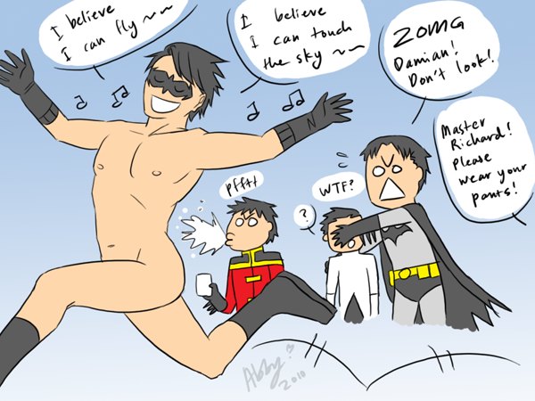 Well, one time Mirage - a superchick, worked with the Teen Titans blah blah blah - disguised herself as Starfire, slept with Dick, and then gloated about it the next morning while Dick was looking very, very alarmed and one of the other superchicks, erm, I forget her name, called Dick a slut.Dick got called a slut in canon. WIN.And the other time, these demon things of the seven deadly sins turned up, and Dick got hit by Sloth and Starfire by Lust, so she sort of... jumped him while he couldn't move.Because, as OP said, he gets /everyone/ hot and bothered.(Also, his original Robin costume? Totally had only short shorts. No pants. Aurgh, Batman is creepy.)