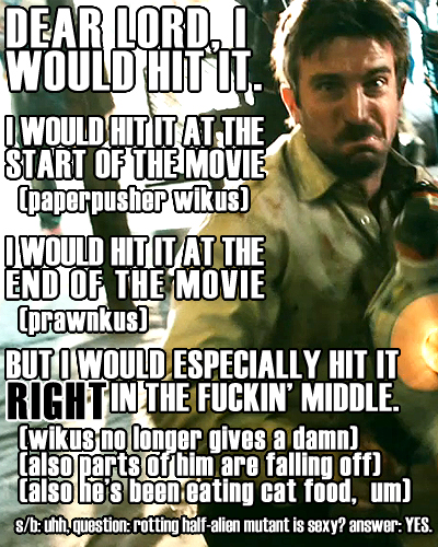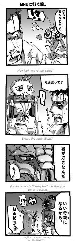 Title is something like 'going to MNU' (I can't read the last kanji, it's too small)Panel 1 (Kid prawn?): Hey look, we're the same!Panel 2Wikus thought: What?Panel 3:(I assume this is Christopher?): He likes you.Wikus (off panel): Huuuuh?Panel 4Christopher: ['creepy' sound effect (gah)(no seriously, that's what it says, 'gah'] ...Might make a good mama.Wikus: WHAT?!...nobody cares about this, huh? Derp.