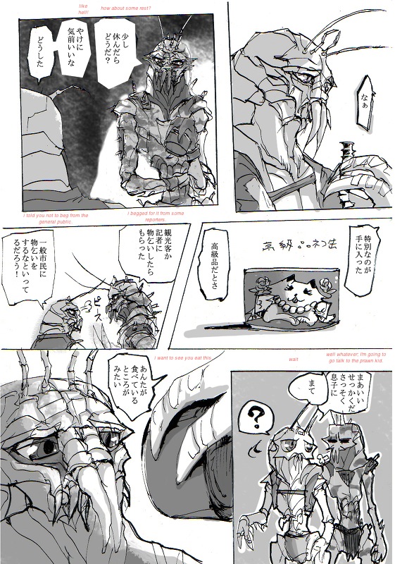 Okay, I'm lost, I have no idea which ones these are. Uh. Yeah. I'm gonna call them Guy and General. Guy is the one in the first panel here, and General is the one who has the can of cat food.Panel 1General: Hey.Panel 2General: How about some rest?Guy: Like hell. [sarcastic] You're so generous. Guy: What's wrong?Panel 3General: I have a special thing.Guy: Real luxury goods, here.Panel 4General: [giving 'peace' sign, but it's actually a 'V' for 'victory'; it's a japanese mannerism][sound effect says 'pose' as in he's posing heroically] I begged it off some tourist reporters.Guy: [huffs/sighs] I told you not to beg from the general public!Panel 5Guy: Well, whatever. I'll go chat with the [prawn kid] (I dunno what the kid prawn's name is, sorry.]General: Wait.Panel 6General: I want you to eat this. [I want to see your eating [of] that, happen.]