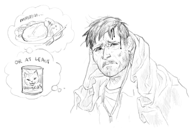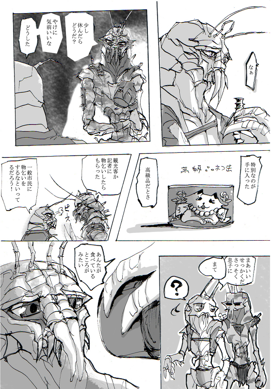 Okay, I'm lost, I have no idea which ones these are. Uh. Yeah. I'm gonna call them Guy and General. Guy is the one in the first panel here, and General is the one who has the can of cat food.Panel 1General: Hey.Panel 2General: How about some rest?Guy: Like hell. [sarcastic] You're so generous. Guy: What's wrong?Panel 3General: I have a special thing.Guy: Real luxury goods, here.Panel 4General: [giving 'peace' sign, but it's actually a 'V' for 'victory'; it's a japanese mannerism][sound effect says 'pose' as in he's posing heroically] I begged it off some tourist reporters.Guy: [huffs/sighs] I told you not to beg from the general public!Panel 5Guy: Well, whatever. I'll go chat with the [prawn kid] (I dunno what the kid prawn's name is, sorry.]General: Wait.Panel 6General: I want you to eat this. [I want to see your eating [of] that, happen.]