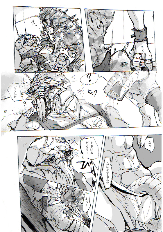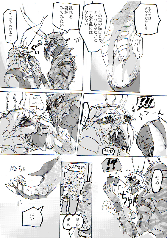 >>45900I think I might have it. Is it this one?Wikus shuffles backwards, prawn hand splayed against the wall of the drop ship. “Christopher…you’re starting to freak me out..” He tries to dredge up a laugh, but the sharp sounds falters into an alarmed squeak as the larger prawn looms above him.The large prawn shudders, antennae flicker above Wikus’ face. Wikus swallows nervously as a low trickle of a growl eases from the prawn’s throat.“…pheromones..” Christopher manages to grunt, his face buried against Wikus’ neck. The hybrid releases a small yip of surprise and mortification when the prawn’s hand slides down his waistband and curls underneath his shaft. Claws gently press against the swollen throbbing cloacae, probing the origin of the alluring scent molecules and creeping moisture that teases the larger prawn so.“Oh no no no No!” Wikus gasps and shoves his hands against the prawn’s shoulders, “Don’t you dare--” The hybrid arches in shock when the claws crook and drag along the trembling walls of the opening. Wikus whines and his hands flinch and now cling onto the prawn’s wide jutting shoulders.The smaller hybrid enforces minimal resistance as the larger prawn snarls at the flimsy cloth that bars him from Wikus’ exoskeleton and human flesh. With a flash of claws from his free hand he rends strips and ribbons of cloth until he bares Wikus from the waist down as the shorn material loops around their legs and feet.Wikus hides his face disgusted by the spread of the prawn carapace that covers half of his body while continuing to spread with a lattice of spider web roads across his chest; his entire groin and both thighs almost completely overtaken by the infection. “Don’t look at me.” He snaps, wilting under Christopher’s heavy gaze.“Why?” The larger prawn asks.“B-Because it looks awful!” Wikus growls underneath his breath, “I don’t know what is worse: half of my flesh rotting away or the other half caked in blood but not hiding this alien armored skin.”“I do not think that it looks horrid.” Christopher whispers, hand raking down the harder prawn plates and pale moon human flesh, stirring a shudder of breath from the smaller hybrid. He bends forward and traces his curl of mandibles and tentacles down the seams of damp trembling flesh. His pair of antennae quivers with excitement as he tastes the enrapturing mixture of scent and flavors, Wikus’ pheromones unconsciously spiking as the larger prawn traces and maps his flesh. “You look and smell beautiful to me.”“Aaaah--” Wikus swallows nervously as his quivering legs give out underneath the warm mouthing and tasting, and he slides further down the wall to loosely sprawl across the floor of the ship, the shadow of Christopher eclipsing the remaining territory of ivory flesh. Wikus stutters as Christopher guides him to spread his bare thighs open to allow the larger prawn to smoothly slip in between. “C-Christopher?”The larger prawn purrs and clatters soothingly. Claws slide up tense thighs as he urges Wikus to remain calm and relaxed. “Your body desires this.” Christopher peers down between Wikus’ legs noting the gleam of pale gray liquid that trickles from within the depths of the smaller hybrid’s opening. Christopher shudders violently, proboscis swells and extends. His body curled and growling with the desire to copulate and lay his spawn within Wikus, nestle the egg deep within the smaller hybrid.“I don’t know what I want.” Wikus capitulates. Eyes flare wide with alarm as Christopher shows no sign of ceasing his advances, “W-We shouldn’t rush things..” Wikus tires to plead and negotiate.Christopher patiently shushes the timid hybrid. He twists his hands against Wikus’, binding them together as he hunches over the smaller man.Wikus gasps as his thighs are bumped by the avid seeking proboscis, the waving appendage nudging and seeking the warmth and pheromones. “Christopher!”Christopher lunges when the extended shaft pierces the throbbing aperture, spearing the smaller hybrid. Wikus jerks and thrusts against his hard chest, cries out and throws his head back at the lance of pain as the rigid invader splits him open.The larger prawn needn’t worry about the smaller hybrid wriggling free. His superior body weight easily pins the quivering man. He whispers words of adoration and comfort while his eyes squeeze shut while the hot, drenched tunnel tightens around him. Like a hunter on the prowl his proboscis extends further inside Wikus, stretching and thinning until it reaches the deeper cavity where he may pierce and begin the process of fertilizing and creating an egg within.Wikus jolts as the deeper set of fleshy walls are gently severed by the flexing tip of the invader, the wriggling, nudging tip of Christopher’s proboscis stretching so deep. The stretch and stimulation stifle his attention that surrounds the sharp pain of initial penetration, and the smaller hybrid whines and arches his chest to bump Christopher’s, thighs trembling around the larger prawn’s compact waist.Christopher chatters a short burst of clicks, hips quiver as the smaller hybrid whimpers and thrusts against him. The larger prawn snaps forward, imbedding his proboscis deeper before withdrawing sharply with small surges of thrust and pull, the agitating friction causing Wikus to curl against him.Wikus presses his mouth against Christopher’s shoulder, a babbling voice in the back of his mind warning not to bite down and risk scattering the remainder of his teeth if he exerts too much pressure.A large hand weaves through his tufts of soft hair while another pushes and guides against the small of his back, encouraging Wikus to thrust in counter to Christopher, the smaller hybrid sighs and gasps while his thighs fall open even further, allowing him a teasing glance of their hips bumping together in a static of thrusts and rolling bumps as their reproductive organs 