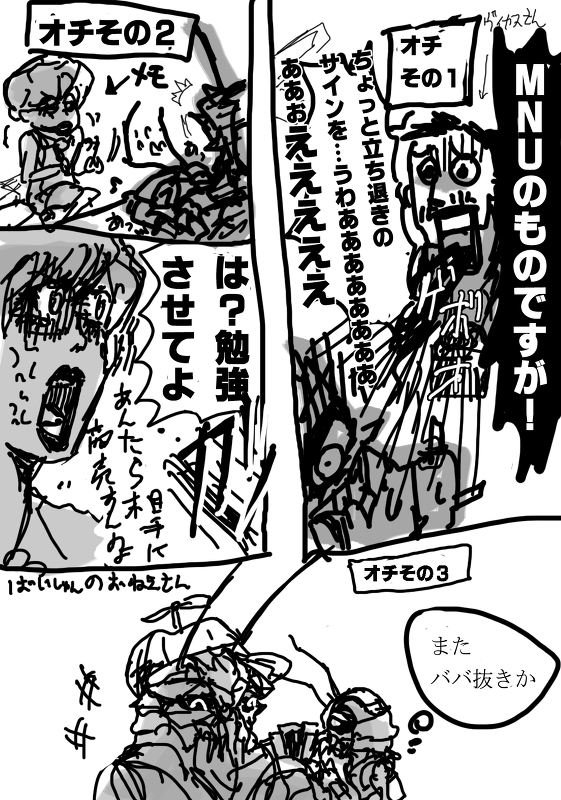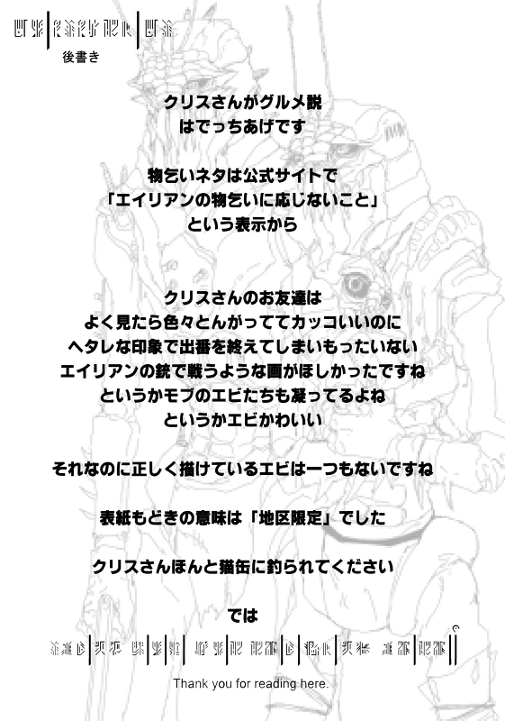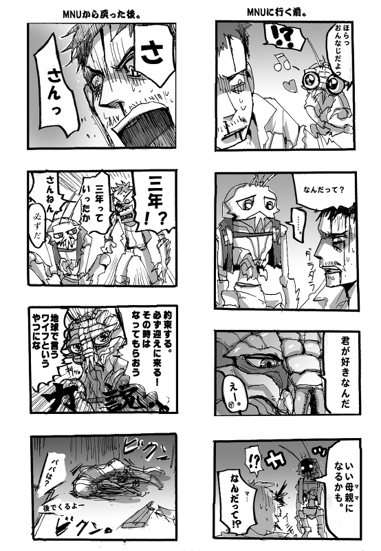 Title is something like 'going to MNU' (I can't read the last kanji, it's too small)Panel 1 (Kid prawn?): Hey look, we're the same!Panel 2Wikus thought: What?Panel 3:(I assume this is Christopher?): He likes you.Wikus (off panel): Huuuuh?Panel 4Christopher: ['creepy' sound effect (gah)(no seriously, that's what it says, 'gah'] ...Might make a good mama.Wikus: WHAT?!...nobody cares about this, huh? Derp.