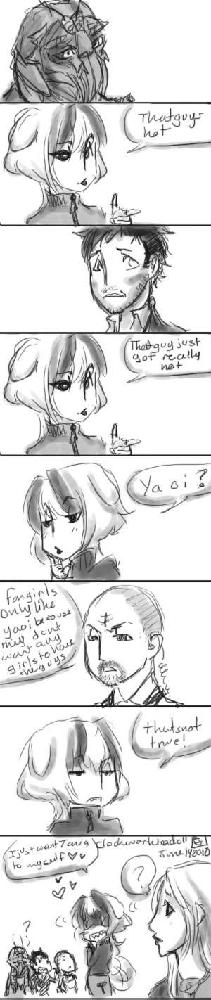 >>41013 I'd love to do so, but I don't have a kanji dictionary, and my Japanese is terribly limited. I can only pick out a few of the words and phrases: "Wait." "Stop." "Please look at me."(I think), plus some of the, er, noises.But holy crap, D9 doujinshi. I never thought I'd see that. I may have to finally buy a kanji dictionary. :)