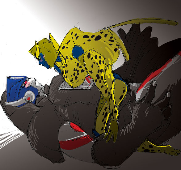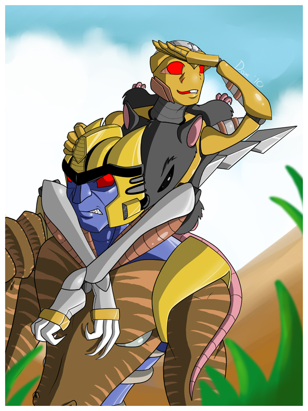 I cometh bearing fanfiction. Also sauce: http://parabiguous.livejournal.com/2040.html----------Title: HiddenRating: RWarnings: Anal, Rough play (biting, clawing, etc.)Synopsis: Dinobot and Rattrap are unknowingly caught in an odd position aboard the Axalon.Other Shit You Should Know: Rats have been known to mate up to 40 times in one day. THE MORE YOU KNOW!“Lousy Pred!”“Dirty rat!”“Slag-spoutin’ saurian!”“Filthy vermin!”“Nnn—hey! Be careful wit’ dat thing! Ya could put someone’s optic out!”“Quite a feat, considering that is not where I am trying to—! Grr—! If you could cease your constant squirming for two kliks then maybe I could work out a—““Shut up! I wouldn’t be squirmin’ if ya could just—Oh PRIMUS! Choppa'face! Right there…right THERE!”Rattrap threw his head back in ecstasy, his incessant squirming having finally achieved fruition. The price paid now was his leg bent up at an awkward position, straight up against Dinobot’s chest and the end of his foot actuator resting on his collar. The price paid later would be severe pain in his joints and tendon-circuits.One of Dinobot’s taloned servos moved up, grasping said leg and digging in for a bloody hold. Rattrap hissed. Dinobot hissed right back.“Be silent, vermin!” the lizard snarled, voice low and harsh. “The security cameras might not feed information from our current location, but this area is hardly soundproof!”“Mmm…ya sound scared, Scale-belly,” Rattrap breathed, chuckling dizzily. He was wearing an expression best described as ‘smug douchebaggery’. “Dis was your idea…”Dinobot positively seethed. “To interface, perhaps…” he growled, arching his back upwards and leaning closer to Rattrap. His hot breath tickled the nape of the spy’s neck, making him writhe. His claws dug deeper into his leg, and pink energon trickled down the jittering limb. “But it was not my intention to interface beneath the damned floors of the Axalon!”“Wh-what?! Ya wanted to ‘face somewhere the cameras couldn’t see us!” Rattrap retorted.“Nnn…this is what I get for asking a scurrying rat for his opinions on mating grounds…A mistake I shan’t make again,” Dinobot mumbled.“Criminy, wouldja quit yer complainin’ and just work dat rhythm of yours?”Dinobot grunted, baffled as to how the blasted rodent could remain so infuriatingly calm. He snorted once, then lunged forward and sank his razor sharp dentals deep into the side of Rattrap’s neck, making him yowl.“AAHN!! S-slag, Choppa'face!” Rattrap stammered, his cocky attitude quickly fleeing the vicinity. He brought a servo up and smacked the side of Dinobot’s head, but all that earned him was a deep-throated growl and sharp pain digging deeper into his nerve circuits. He felt the saurian’s glossa sliding along the open wound, tasting his energon. He smacked the side of his head again, and this time was rewarded with Dinobot’s claws gripping his leg harder.“I thought we was supposed to be quiet, Bronto-brain! Aack—! Ow! Stop dat, or tings’ll only get louder!” It was exceedingly difficult for the rodent to sound even remotely threatening in this position; bucking and writhing enticingly against his far larger partner as he was penetrated eagerly—it would have been hard enough without Dinobot biting into his neck.“Mmm…I cannot help it!” Dinobot moaned in response, loosening his hold on Rattrap’s neck, but not fully releasing it. “Your screams are infuriatingly melodic.”“Den we have a bit of a conundrum, don’t we?” Rattrap responded quietly. His voice stumbled and tripped over itself in an ongoing battle to remain level.It was a battle soon lost as Dinobot shifted, and attacked the uninjured side of his neck. Lower, this time, closer to his shoulder. The warrior shivered and moaned as he tasted the rat’s energon on his glossa. He pulled back an inch, panting heavily, his breath erratically brushing over the fresh wound.“You taste sweet,” he said thickly.“Oh yeah, dat ain’t creepy at a—“ Rattrap’s retort was cut short as Dinobot shot forward and claimed his lips in a sharp, passionate kiss. Glossas wrestled for dominance, and dentals scraped, bit, and nibbled. Dinobot was beginning to reaffirm his rough, pounding rhythm with the small bot beneath him, eliciting muffled shrieks from his silver lips.***Optimus had seen more than enough. He straightened up quickly, his optics wide and his faceplate warm. Clearly they hadn’t expected to be caught, and he was more than happy to let them enjoy their ignorance. Quietly as he could, the Maximal commander backed out of the suddenly foreboding hallway and back into the command center.Rhinox turned to look over his shoulder at Optimus as the shaky ape moved into view. He frowned, his fingers lightly resting over the console he’d been busily working at. “Optimus? You OK?” he inquired.“Not really, no,” Optimus responded, his voice initially high but quickly stabling. He straightened up and coughed awkwardly into the palm of his servo. “We’ll need to do some work on the floors, that mesh-wiring isn’t going to work anymore. We need something heavy, uh…solid.”Rhinox raised a skeptical optic ridge. “And why is that?”“No reason, the floors are just a bit loose, I almost fell through!” Optimus insisted. He turned sharply and strolled towards another console, leaning over it. His fingers danced nervously over the keys, searching for something to do.Rhinox frowned. “Optimus, you’re just scanning the same grid over and over.”“Am I? Oh—yes, it would seem I am.”“Mhmm…” Rhinox’s frown deepened, but he didn’t press the issue and turned back to his own duties, while Optimus struggled to find his own.“Oh, and Rhinox?”“Yes, Optimus?”“Cheetor isn’t ever allowed in that hallway.”