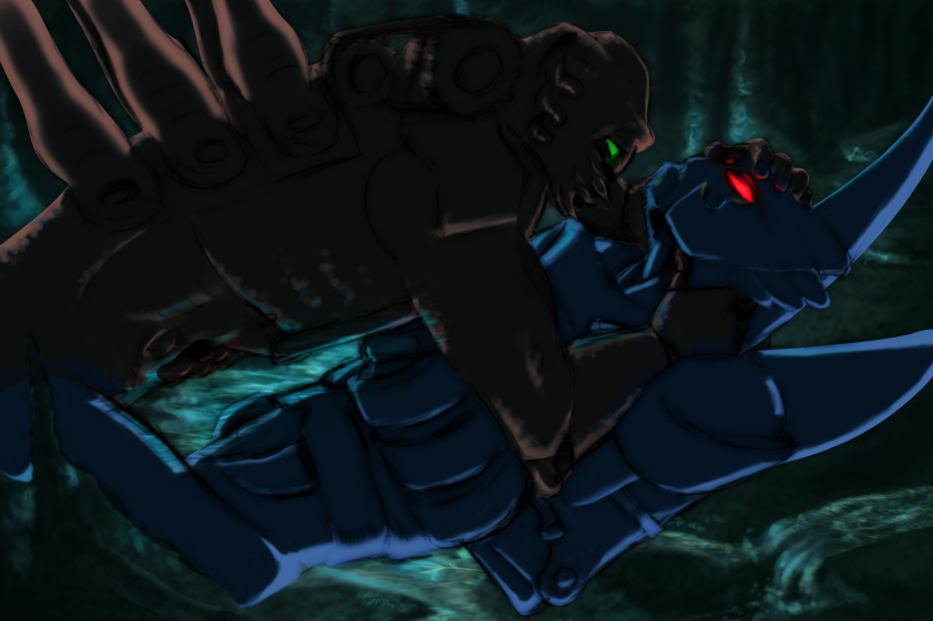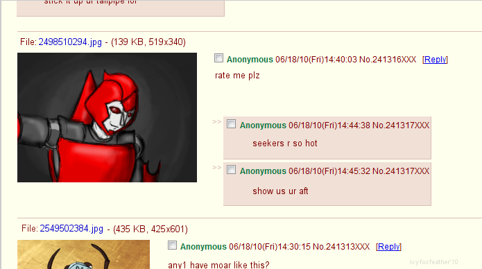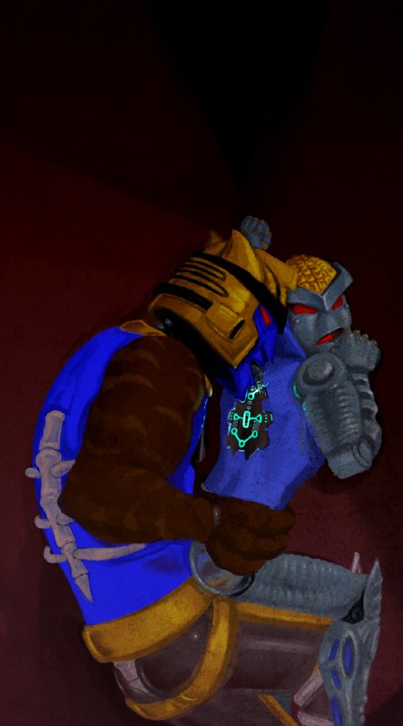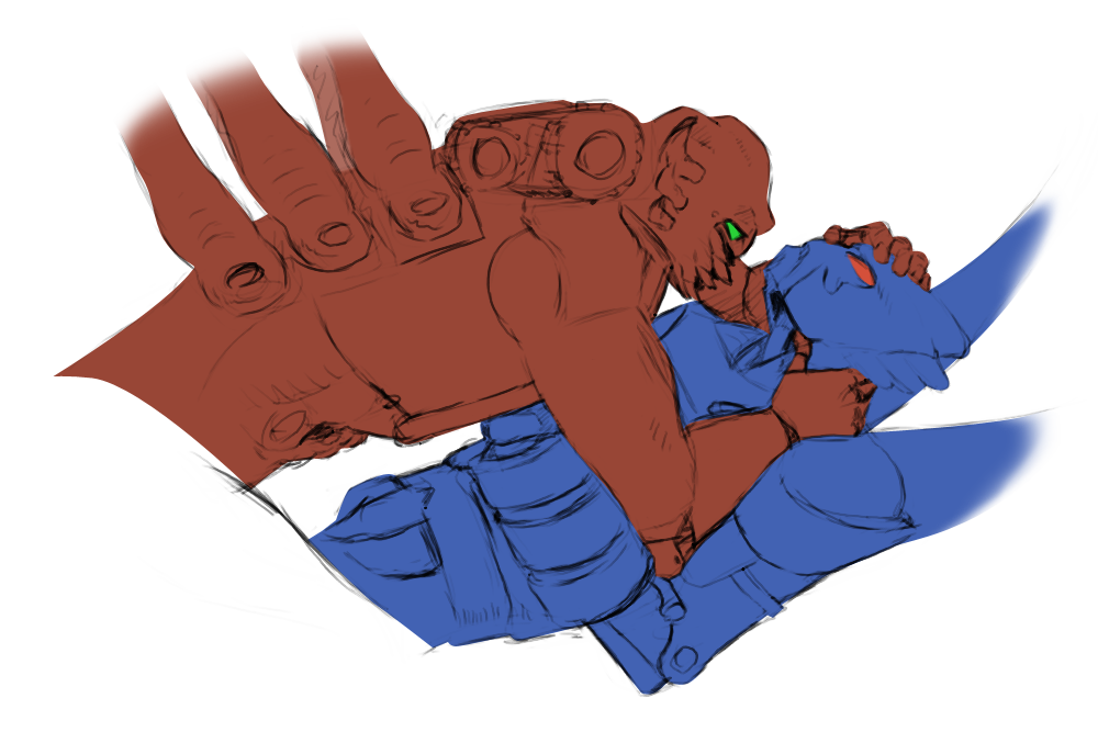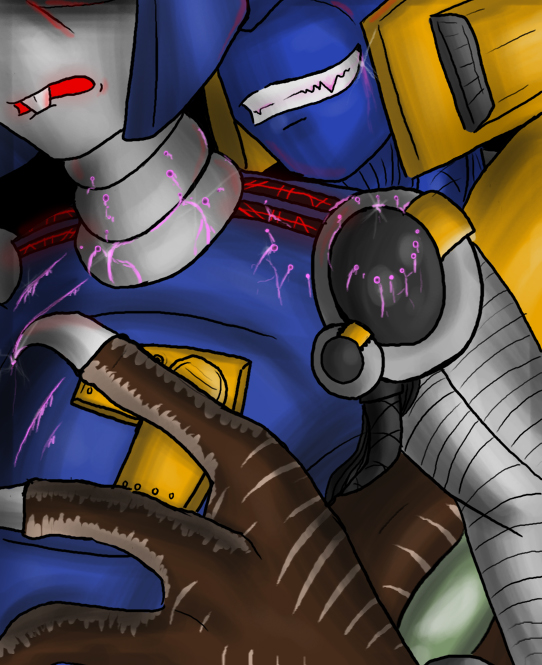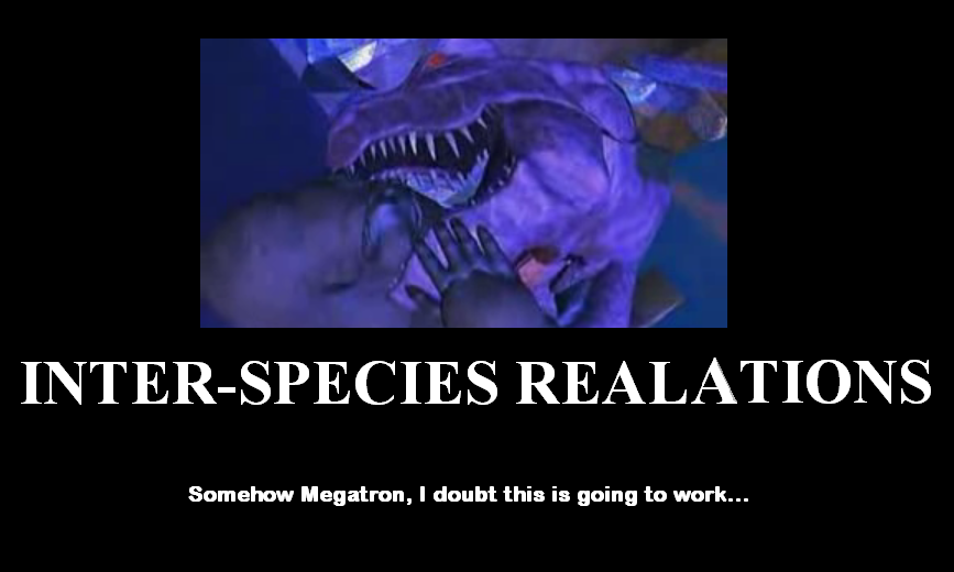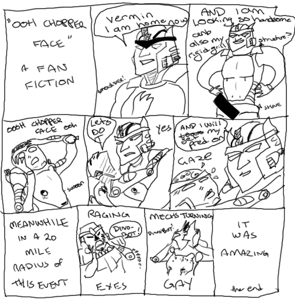 I cometh bearing fanfiction. Also sauce: http://parabiguous.livejournal.com/2040.html----------Title: HiddenRating: RWarnings: Anal, Rough play (biting, clawing, etc.)Synopsis: Dinobot and Rattrap are unknowingly caught in an odd position aboard the Axalon.Other Shit You Should Know: Rats have been known to mate up to 40 times in one day. THE MORE YOU KNOW!“Lousy Pred!”“Dirty rat!”“Slag-spoutin’ saurian!”“Filthy vermin!”“Nnn—hey! Be careful wit’ dat thing! Ya could put someone’s optic out!”“Quite a feat, considering that is not where I am trying to—! Grr—! If you could cease your constant squirming for two kliks then maybe I could work out a—““Shut up! I wouldn’t be squirmin’ if ya could just—Oh PRIMUS! Choppa'face! Right there…right THERE!”Rattrap threw his head back in ecstasy, his incessant squirming having finally achieved fruition. The price paid now was his leg bent up at an awkward position, straight up against Dinobot’s chest and the end of his foot actuator resting on his collar. The price paid later would be severe pain in his joints and tendon-circuits.One of Dinobot’s taloned servos moved up, grasping said leg and digging in for a bloody hold. Rattrap hissed. Dinobot hissed right back.“Be silent, vermin!” the lizard snarled, voice low and harsh. “The security cameras might not feed information from our current location, but this area is hardly soundproof!”“Mmm…ya sound scared, Scale-belly,” Rattrap breathed, chuckling dizzily. He was wearing an expression best described as ‘smug douchebaggery’. “Dis was your idea…”Dinobot positively seethed. “To interface, perhaps…” he growled, arching his back upwards and leaning closer to Rattrap. His hot breath tickled the nape of the spy’s neck, making him writhe. His claws dug deeper into his leg, and pink energon trickled down the jittering limb. “But it was not my intention to interface beneath the damned floors of the Axalon!”“Wh-what?! Ya wanted to ‘face somewhere the cameras couldn’t see us!” Rattrap retorted.“Nnn…this is what I get for asking a scurrying rat for his opinions on mating grounds…A mistake I shan’t make again,” Dinobot mumbled.“Criminy, wouldja quit yer complainin’ and just work dat rhythm of yours?”Dinobot grunted, baffled as to how the blasted rodent could remain so infuriatingly calm. He snorted once, then lunged forward and sank his razor sharp dentals deep into the side of Rattrap’s neck, making him yowl.“AAHN!! S-slag, Choppa'face!” Rattrap stammered, his cocky attitude quickly fleeing the vicinity. He brought a servo up and smacked the side of Dinobot’s head, but all that earned him was a deep-throated growl and sharp pain digging deeper into his nerve circuits. He felt the saurian’s glossa sliding along the open wound, tasting his energon. He smacked the side of his head again, and this time was rewarded with Dinobot’s claws gripping his leg harder.“I thought we was supposed to be quiet, Bronto-brain! Aack—! Ow! Stop dat, or tings’ll only get louder!” It was exceedingly difficult for the rodent to sound even remotely threatening in this position; bucking and writhing enticingly against his far larger partner as he was penetrated eagerly—it would have been hard enough without Dinobot biting into his neck.“Mmm…I cannot help it!” Dinobot moaned in response, loosening his hold on Rattrap’s neck, but not fully releasing it. “Your screams are infuriatingly melodic.”“Den we have a bit of a conundrum, don’t we?” Rattrap responded quietly. His voice stumbled and tripped over itself in an ongoing battle to remain level.It was a battle soon lost as Dinobot shifted, and attacked the uninjured side of his neck. Lower, this time, closer to his shoulder. The warrior shivered and moaned as he tasted the rat’s energon on his glossa. He pulled back an inch, panting heavily, his breath erratically brushing over the fresh wound.“You taste sweet,” he said thickly.“Oh yeah, dat ain’t creepy at a—“ Rattrap’s retort was cut short as Dinobot shot forward and claimed his lips in a sharp, passionate kiss. Glossas wrestled for dominance, and dentals scraped, bit, and nibbled. Dinobot was beginning to reaffirm his rough, pounding rhythm with the small bot beneath him, eliciting muffled shrieks from his silver lips.***Optimus had seen more than enough. He straightened up quickly, his optics wide and his faceplate warm. Clearly they hadn’t expected to be caught, and he was more than happy to let them enjoy their ignorance. Quietly as he could, the Maximal commander backed out of the suddenly foreboding hallway and back into the command center.Rhinox turned to look over his shoulder at Optimus as the shaky ape moved into view. He frowned, his fingers lightly resting over the console he’d been busily working at. “Optimus? You OK?” he inquired.“Not really, no,” Optimus responded, his voice initially high but quickly stabling. He straightened up and coughed awkwardly into the palm of his servo. “We’ll need to do some work on the floors, that mesh-wiring isn’t going to work anymore. We need something heavy, uh…solid.”Rhinox raised a skeptical optic ridge. “And why is that?”“No reason, the floors are just a bit loose, I almost fell through!” Optimus insisted. He turned sharply and strolled towards another console, leaning over it. His fingers danced nervously over the keys, searching for something to do.Rhinox frowned. “Optimus, you’re just scanning the same grid over and over.”“Am I? Oh—yes, it would seem I am.”“Mhmm…” Rhinox’s frown deepened, but he didn’t press the issue and turned back to his own duties, while Optimus struggled to find his own.“Oh, and Rhinox?”“Yes, Optimus?”“Cheetor isn’t ever allowed in that hallway.”