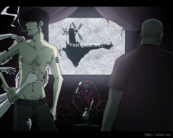 >>47565>>47564Oh god, unf.Last night Pepper sent me some skitzo porn she was writing, bits and pieces here and there but omg here is the first paragraph and I thought that if I posted it here, the peer pressure would make her be unlazy:He's seventeen, and he's almost thirty. It doesn't really bother them. They're not in a relationship, it's no big deal. It's all about good sex and bad company; they've both had girlfriends, they both sleep around, but sometimes they'll meet in a public restroom at 3AM for a smoke and a rough shag. Sometimes they'll talk afterwards, and smoke some more, and they're both sure the other is no good for them.And when Murdoc fucks him up against the stall door, they both know it's nothing personal.