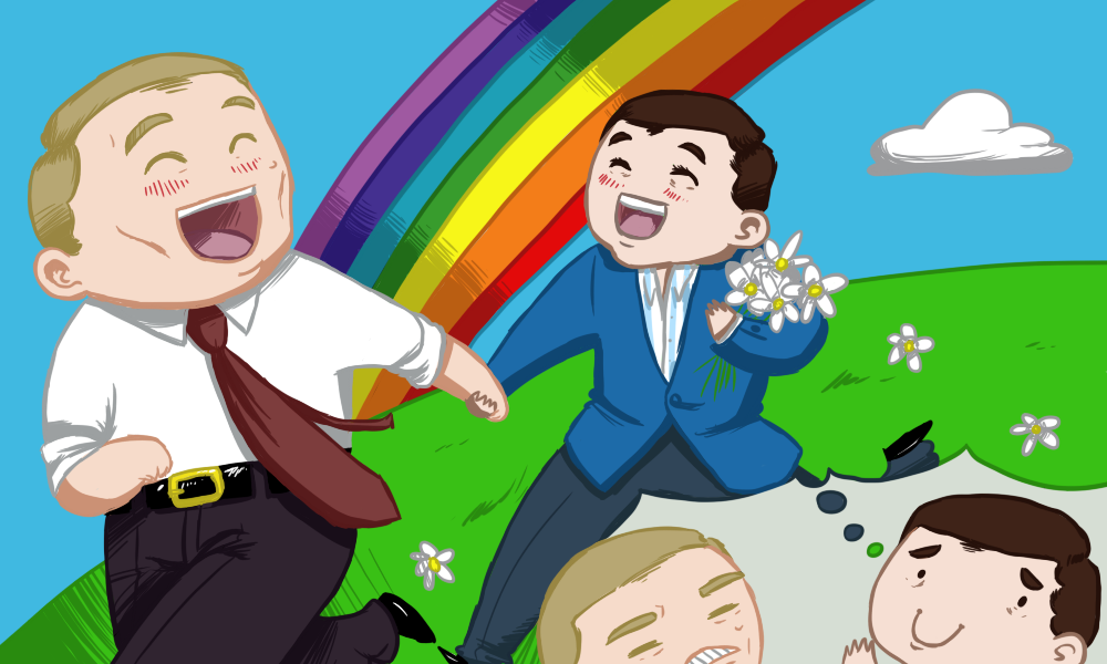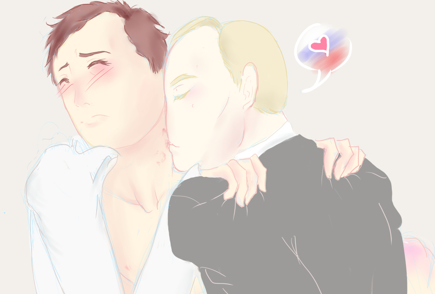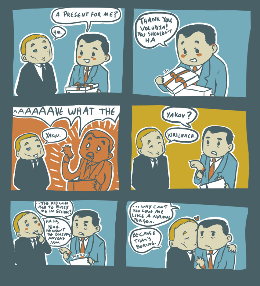 I stand on the podium in the Andreev hall of the Kremlin, and you’re next to me, pale and stressed.Every word in my speech is planned out, and I read its contents in a deep voice that took many hours of rehearsing to get right. But the excitement is so strong I keep almost stuttering. Edits are made in necessary spots, and the show goes on, dictated by an invisible director.I have long known of you feelings for me, and I have always taken your devotion to be sincere. But how did you know how to play me right, so I could no longer live without you? And, when I was advised to say we were close and had made all these decisions together, I suddenly realized that it wouldn’t be a lie. These seventeen hard years of my rise, I always felt you were near. You did everything for us to spend more time together, and you knew how to become so irreplaceable that when your hand touched mine, I could no longer keep my balance.Silence – always there during our encounters, as though we fear someone will hear. I bury my face in your hair, inhaling the smell of perfume and your own, barely noticeable. I thrust myself against you and am surprised at the diminutiveness of your body. The small sigh, when I carefully enter you, is the only sound to be heard, except for the almost noiseless rustle of the sheets. I move into you with increasing desperation, and a hot wave begins to appear deep in my stomach and it suddenly washes over me, bringing me to a climax.‘I will give you the whole world,’ I breathe, crumpling on you. You turn towards me, hazel eyes trusting and serious, ‘I can’t give you anything…’Is he serious? The mockery, which will be in so many eyes, the tabloids, the stupid claims of announcers; is he really willing to endure it for me, just so I can profit off him and remain in charge?!But I merely shook my head, driving away unnecessary thoughts. It is simple – you’re convinced what you’re doing is for the good of Russia.He goes down the red path. In his eyes, desperation and determination. The little fellow goes to pick up his crown. The world will come later, but Russia I have already laid at your feet.