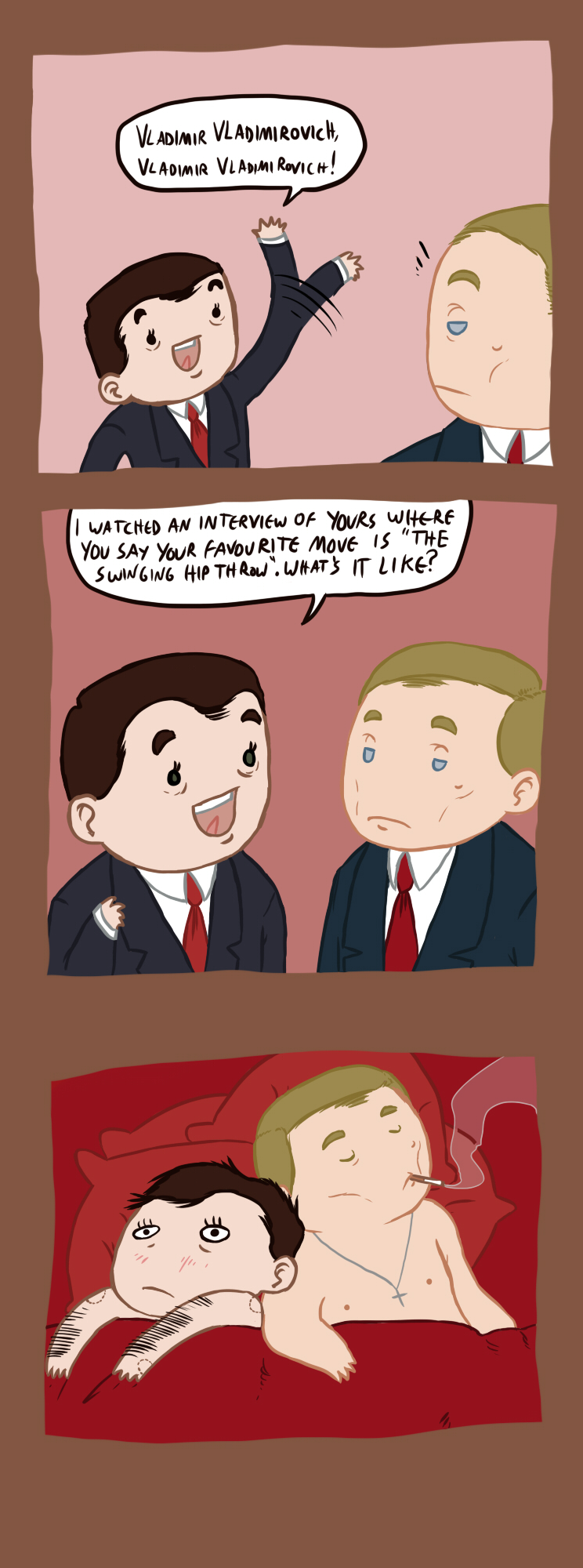 The sound of rain against the window was lulling me to sleep, interfering with my writing.In spite of what is though abroad, Russia is not always cold. Quite the opposite, in fact: sometimes it gets so warm that people die of heatstroke. I know this better than anyone. After all, knowing these things is my responsibility.Of course, in the unheated houses of distant Siberian villages, many succumb to the cold. These parts are forgotten even by God, and the average person has never heard of them. But I know all about those trifling matters – it is my job.I was examining the figures, which concerned the falling population in Russia, while at the same time listening to Pink Floyd’s Division Bell, the music being played quite loudly, louder than was allowed.He didn’t know, and I’m not quite sure myself, but I perhaps did this intentionally.Purposely in order to attract his attention.And, whether I did it involuntarily or not, I succeeded. As the first notes of Poles Apart began to play, my office door carefully edged open. Slowly and deliberately. Everything he did was very much deliberate, never just for show. It was easy to see he was in a bad mood, since he didn’t knock. As a rule, he was irreproachably polite, so any deviation from his nature was a sign of alarm.‘Dmitry,’ he said, his usual impassive expression firmly in place, ‘if you’d be as kind as to turn off that howling noise. You are not in your car.’‘Of course, I’m sorry. I didn’t want to disturb you.’I was acting foolishly. After all, wasn’t his attention what I wanted?‘I was trying to concentrate, and you had to distract me. This isn’t even music, just filth.’I could see Putin was set on receiving an answer to this.But what could I say? ‘Forgive my interfering with you work, I shall proceed to expiate my fault through any means necessary?’I didn’t know what he wanted to hear, and didn’t give this matter much thought. We stared at each other as the minutes floated by, him keeping his hand on the doorknob, as if ready to go at any moment but held back by some invisible force. He was waiting for a reaction from me. I was sitting at my desk in my comfortable leather armchair; the monitor’s light flickering, and desperately hoping he wouldn’t hear my thudding heart. Vladimir quit working for the secret services long ago, but being in the KGB is a lot like riding a bike: you never forget how the motions go. Intimidating people and suppressing their will is already a fully automatic habit in him.‘It’s not filth,’ I finally answered, ‘I brought this music along because I thought you might enjoy it.’Surprise flashed on his face, but his expression smoothed over in half a second. It was still a rare manifestation of emotion, which in itself was unique. And valuable – to me.‘How can you assume such things? Since when do you know what I “might enjoy”?’I shrugged.‘Well, I don’t know. Everyone likes it. Everyone I know’‘Interesting comparison. And here I thought I was quite unique,’ Putin smiled, but his icy grey eyes remained cold.Uniqueness goes hand in hand with solitude, I thought, but he remained silent. It was obvious that something was irritating him, and I hoped with all my might that neither I nor my music had caused this reaction.‘I was told that you again ordered your subordinates to neglect the rumour about our association.’I considered the answer about a second. In these cases, pensiveness was of no use.‘Yes. I thought about this while at the IMET, and denying it makes sense. It will prevent rumours about our supposed close connection. About the fact that I’m assumed to belong to you, like some doll.’This made him smile, as I knew it would.‘I wonder if some people speculate,’ he started, finally going away from the door and heading towards the window. I followed his movement with my eyes, and saw that the rain still flowed outside, making for quite a depressing view, ‘because of things such as my physical talents and your exploits in yoga. Why, people might be scared I’m wearing you out. Dolls have limits too, you know, and will cave in if pushed right.’The ambiguous joke made me redden and bury my face back into the computer screen. I couldn’t bear to look at him. The tension was too high.Four months of abstinence had also put their strain on me – Svetlana, because of the female disease, did not allow me to come close to her. She would complain endlessly to feel better, usually while she ran herself a bath, and in moments like that, accompanied by the sound of flowing water that was omnipresent on this rainy day, his features would appear behind my eyelids; a mocking gaze, a flipped nose, wide arms, strong hands… I had to restrain myself from moaning there and then from the rushed excitement, vicious, shameful, so sharp and alive and impossibly forbidden.The imagination sketched unmentionable pictures as I stole glances at him, and as time went by, they pushed the limit of decency further, again and again, until I couldn’t look at him without being reminded of even the smallest details of my fantasies, from the intermittent wheezes and the trembling, to the feeling of being engulfed in convulsing ecstasy, every shred of energy torn from me.And now, imprisoned in my office with him, I wondered how much of the queer way I acted he could interpret, and the question tormented me – could he understand just how much I desired him? I was completely immersed in such thoughts and jumped when he coughed lightly.‘By the way, I’ve been meaning to ask, how are you taking your new way of life?’I looked up from my webcam, set up to film my video blog, and gave an imperceptible shrug. Well, imperceptible to most, he likely saw it all.‘It’s alright,’ I answered, trying to sound unaffected. The diet prescribed to me hadn’t been easy, and I especially remember the sleepless nights caused by the lack of food and comments about m